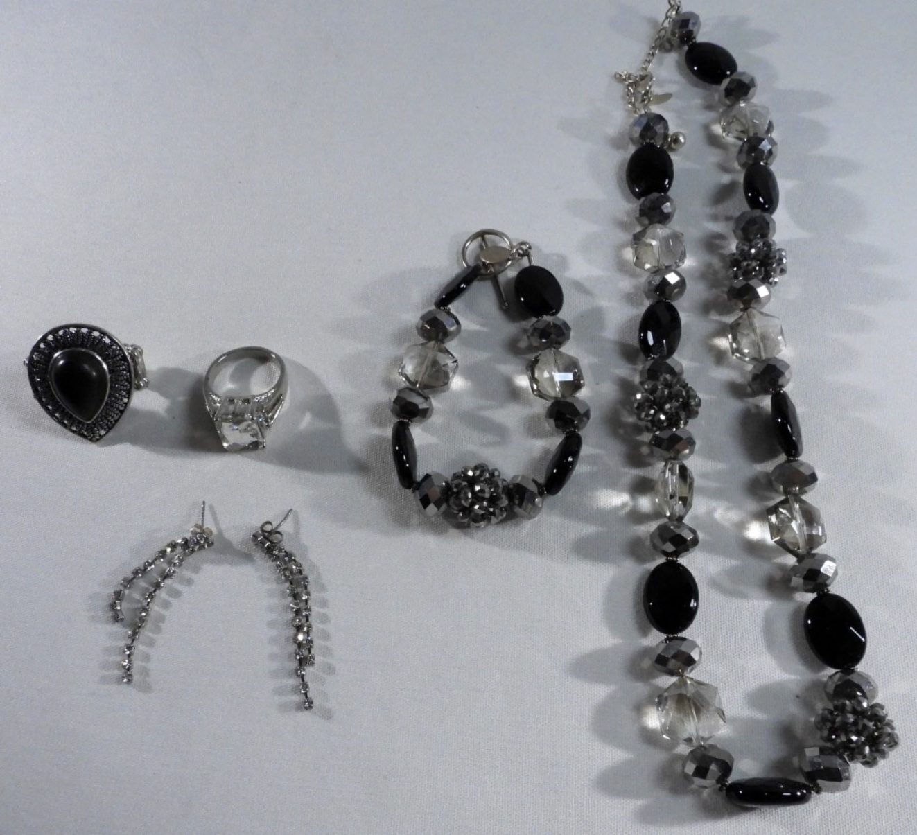 Matching beaded necklace and bracelet, (2) rings size 8. The other ring is a stretch ring. And a pair of rhinestone earrings