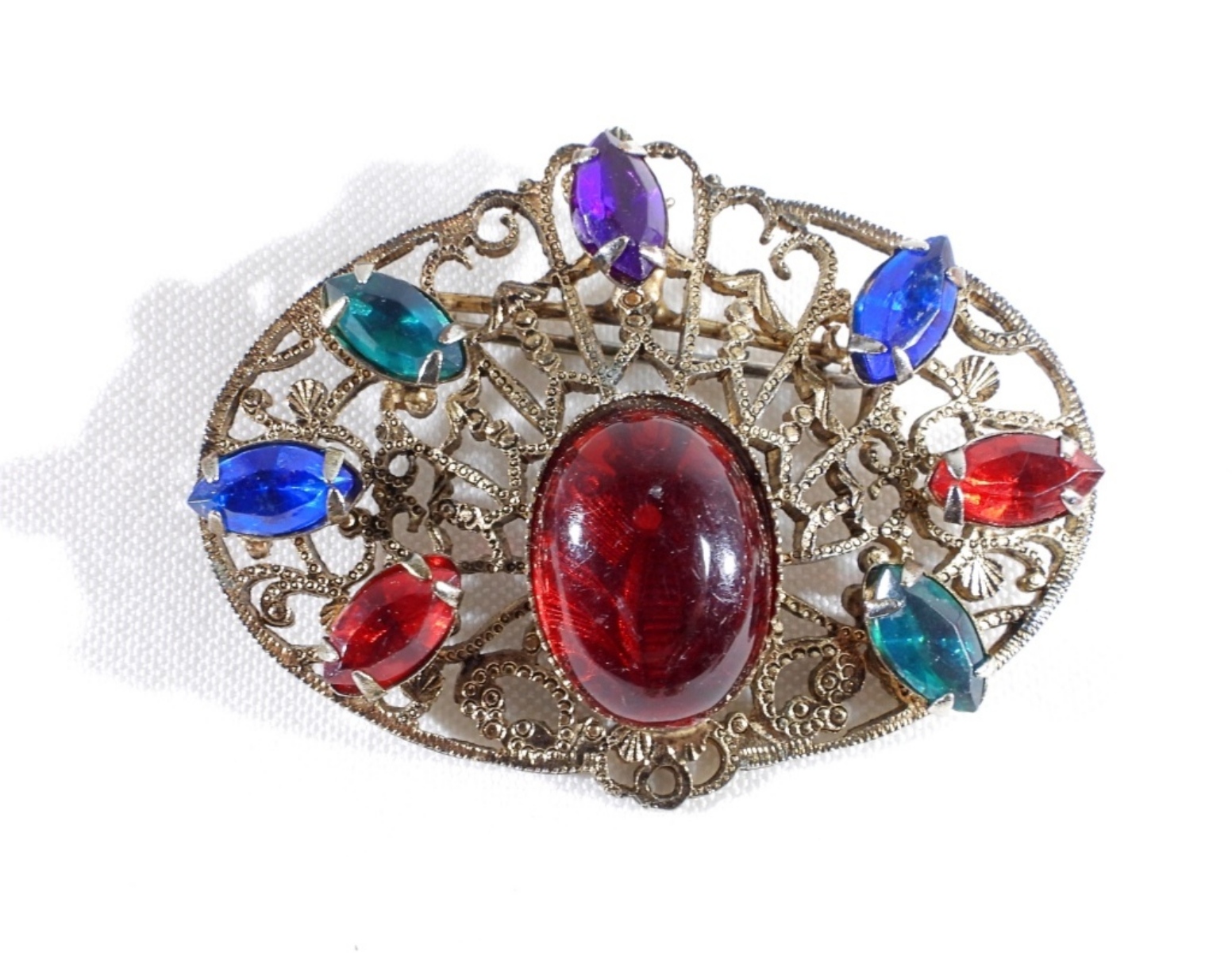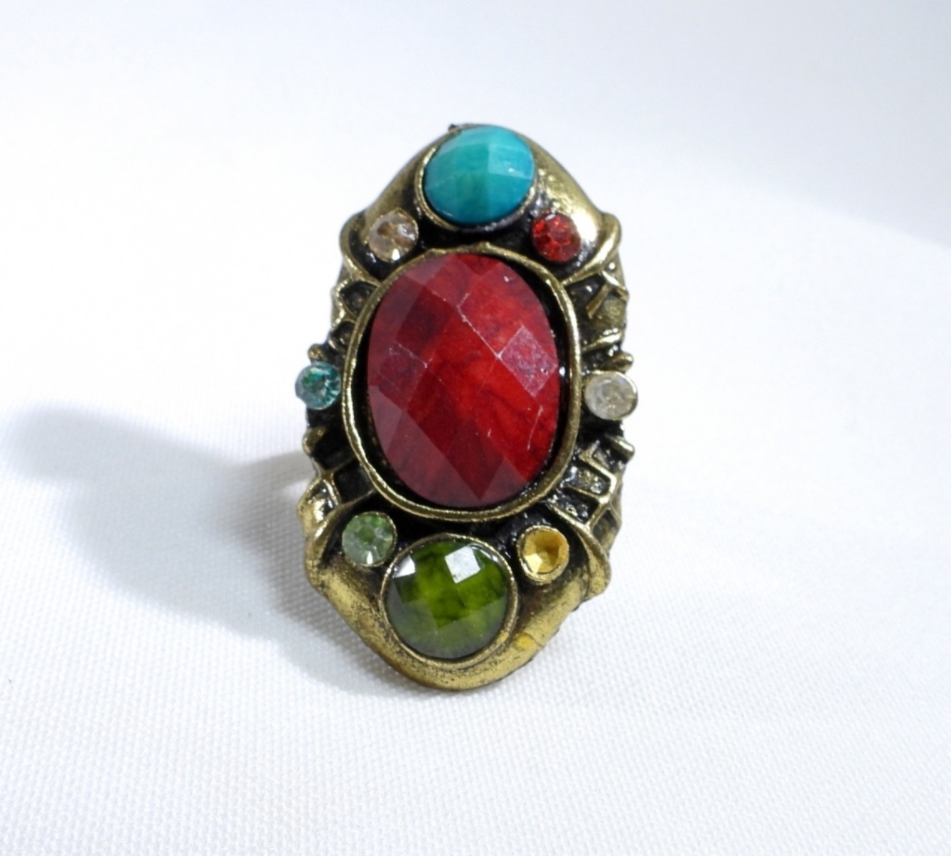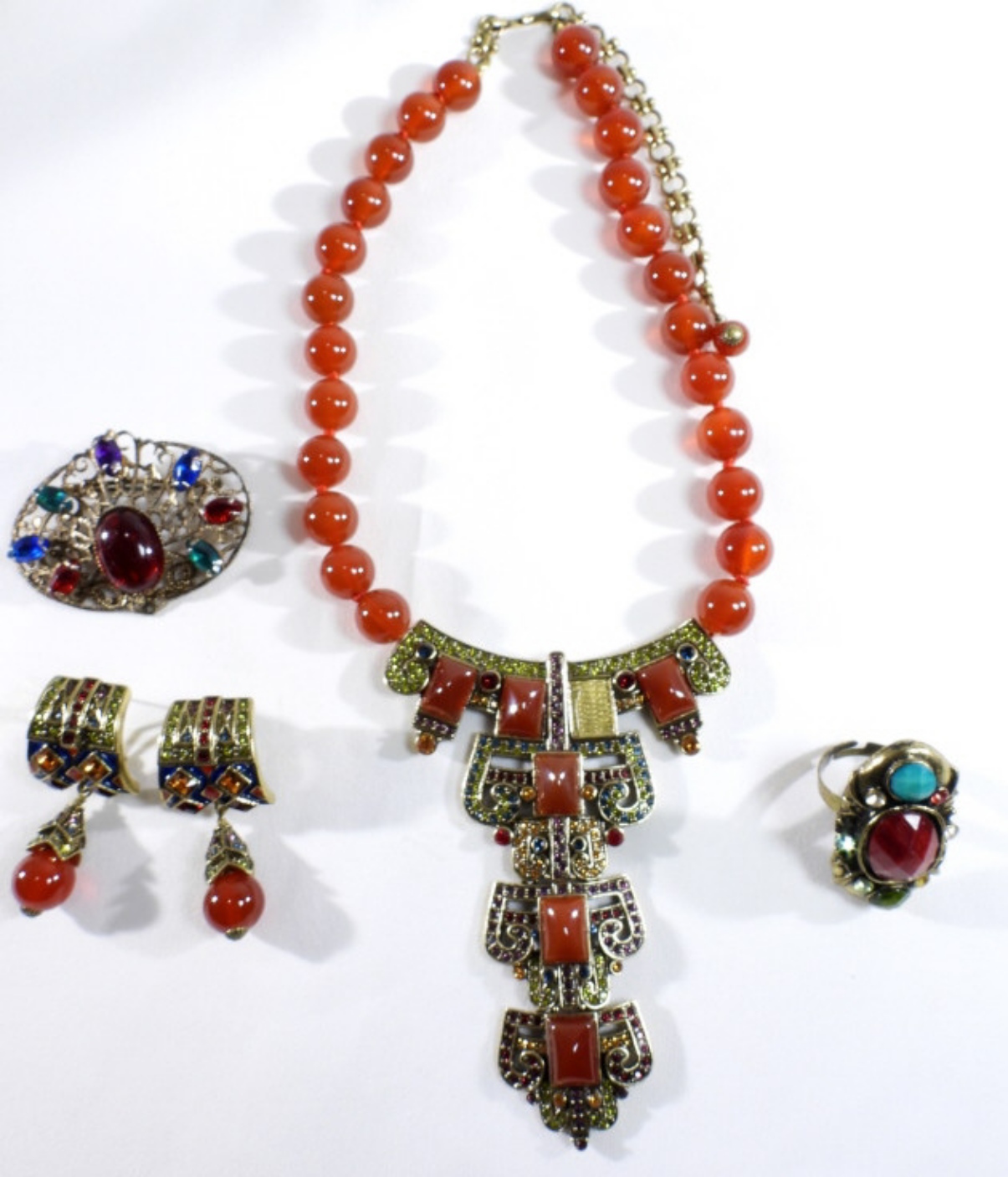 Antique gold-tone women’s lot includes an expandable size range 8-10 with colorful gemstones. A brownish-orange-toned beaded necklace( the metal piece on the necklace is missing a stone), matching earrings, and a