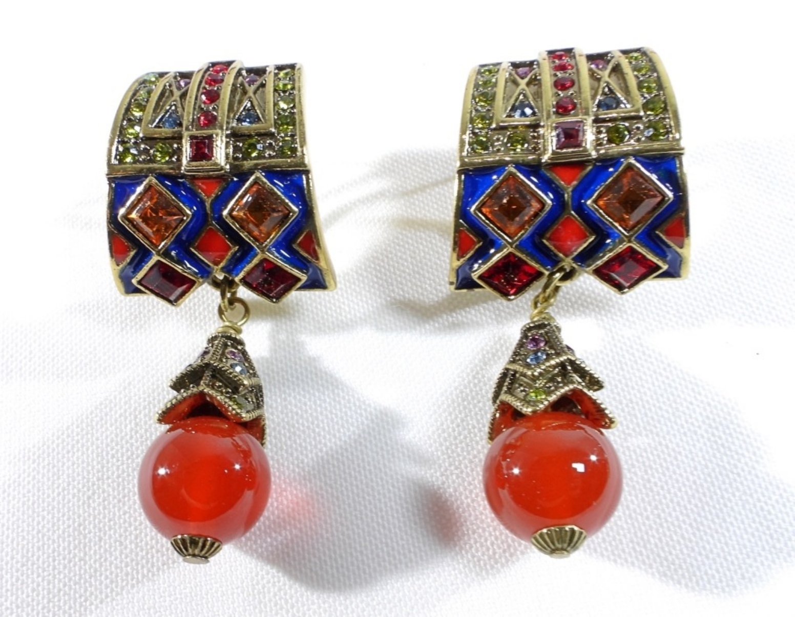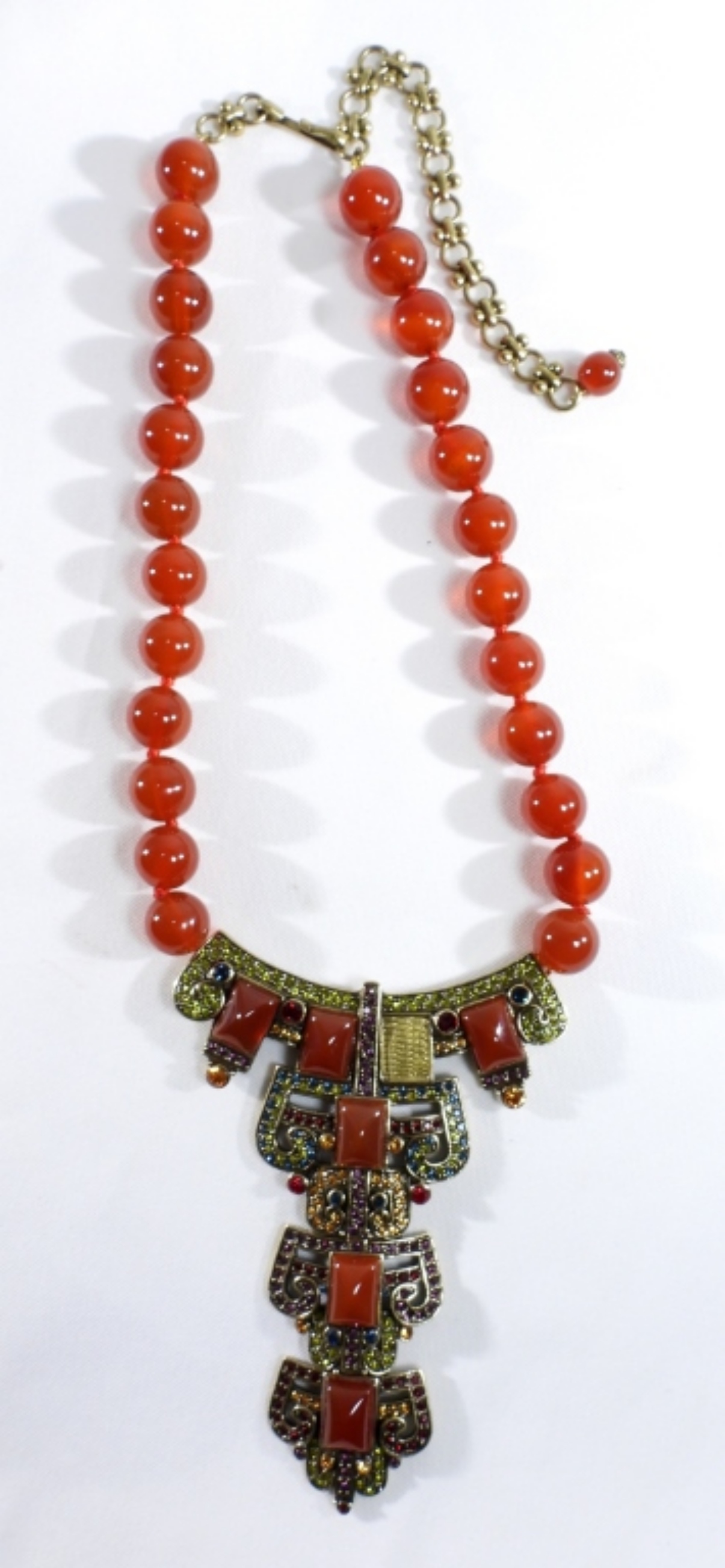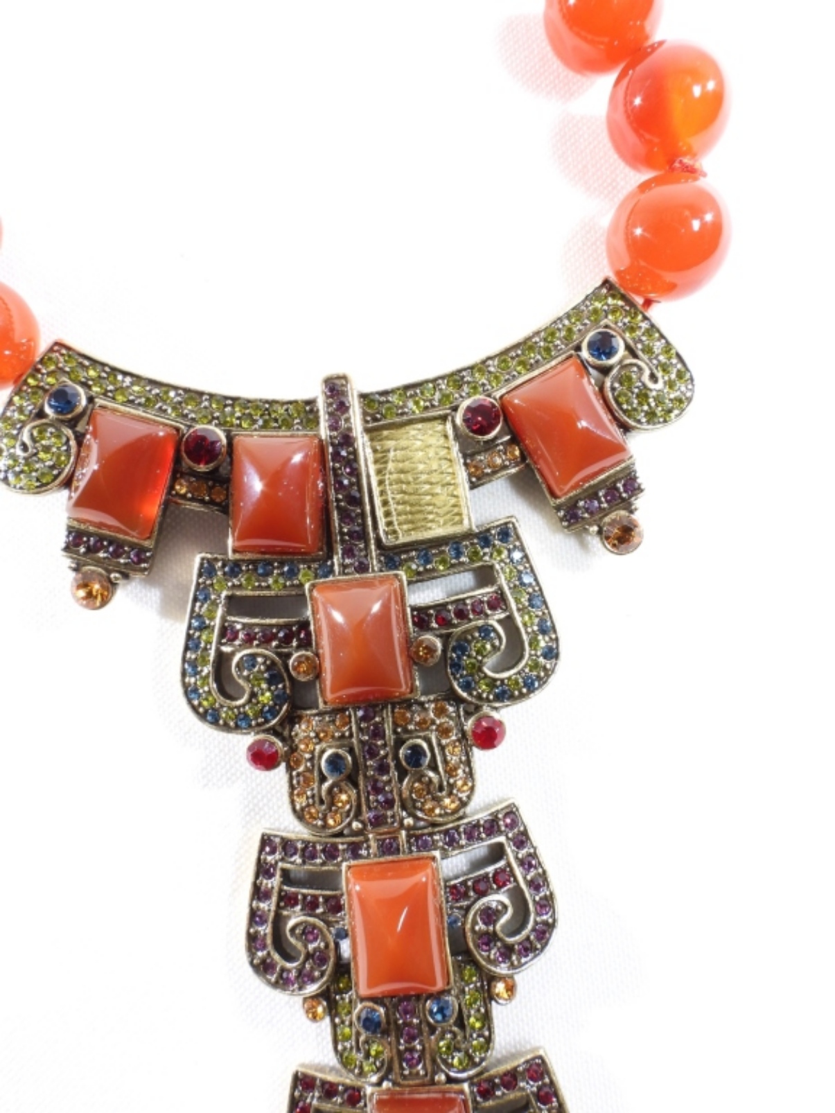 Antique gold-tone women’s lot includes an expandable size range 8-10 with colorful gemstones. A brownish-orange-toned beaded necklace( the metal piece on the necklace is missing a stone), matching earrings, and a