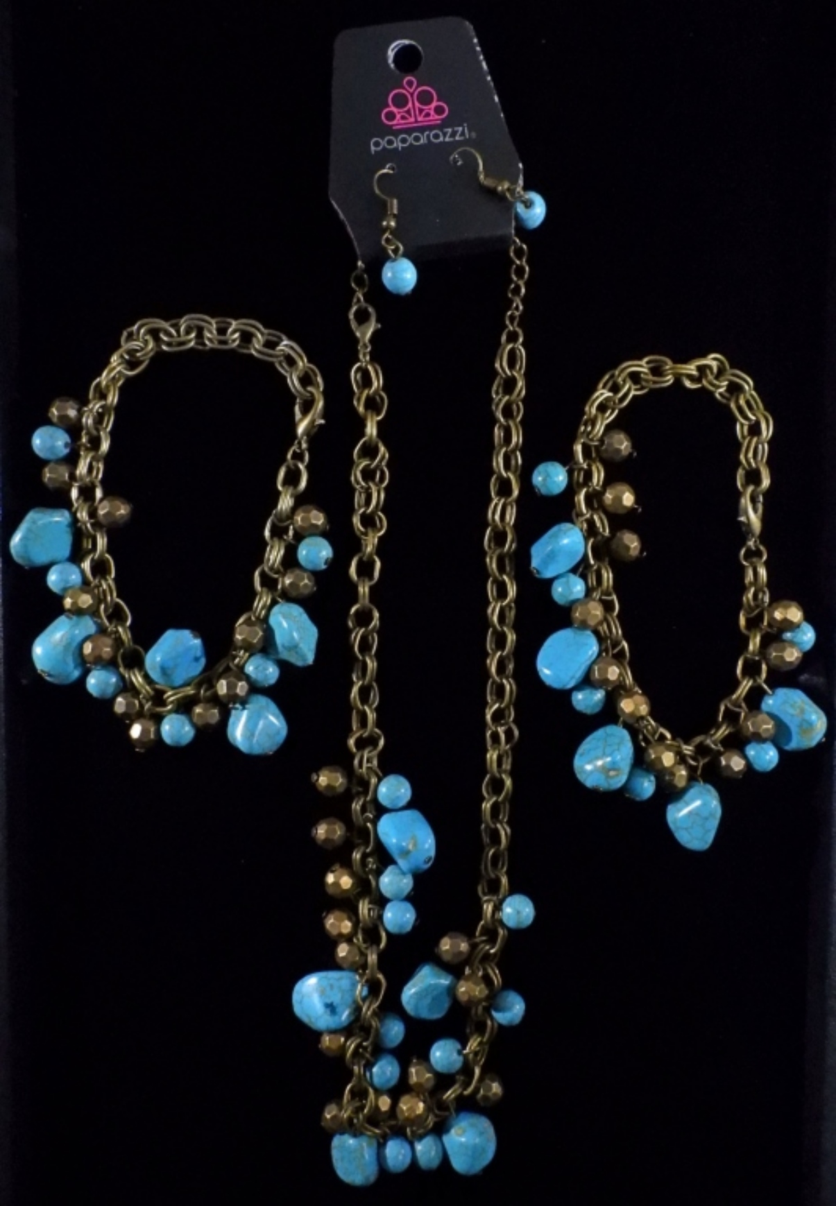A woman’s jewelry set, which includes a necklace, 2 bracelets, and a pair of earrings with all with turquoise stones.