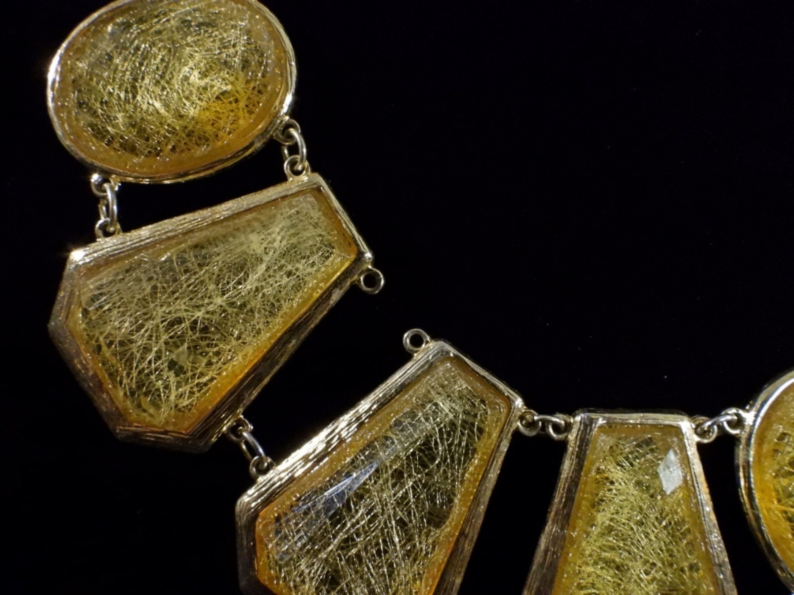 A gold-tone necklace with large gemstones, a ring, and a bracelet (ring size is 9 1/2). A chain link is broken on necklace as shown in picture.