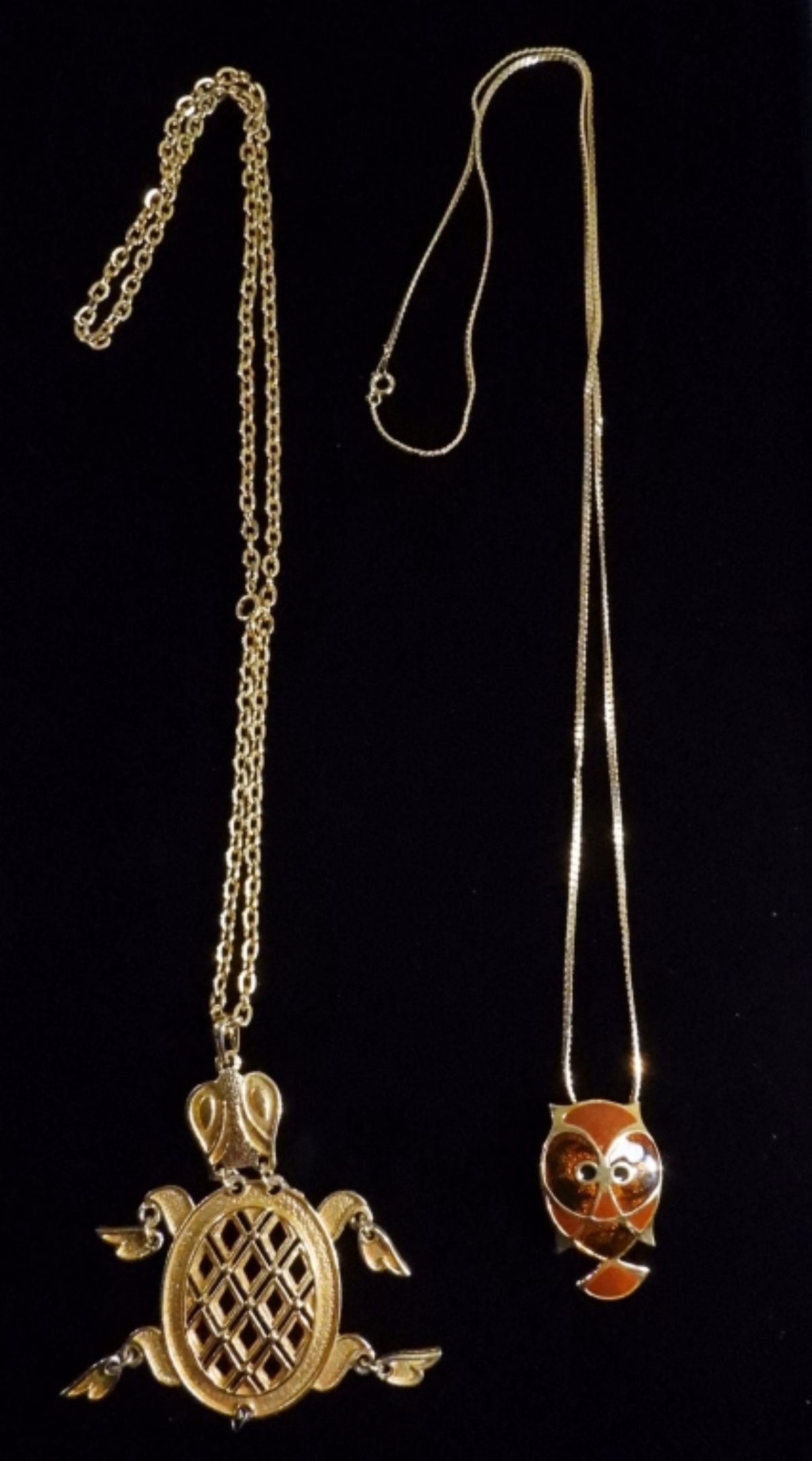 2 Unique gold-tone necklaces with long chains.