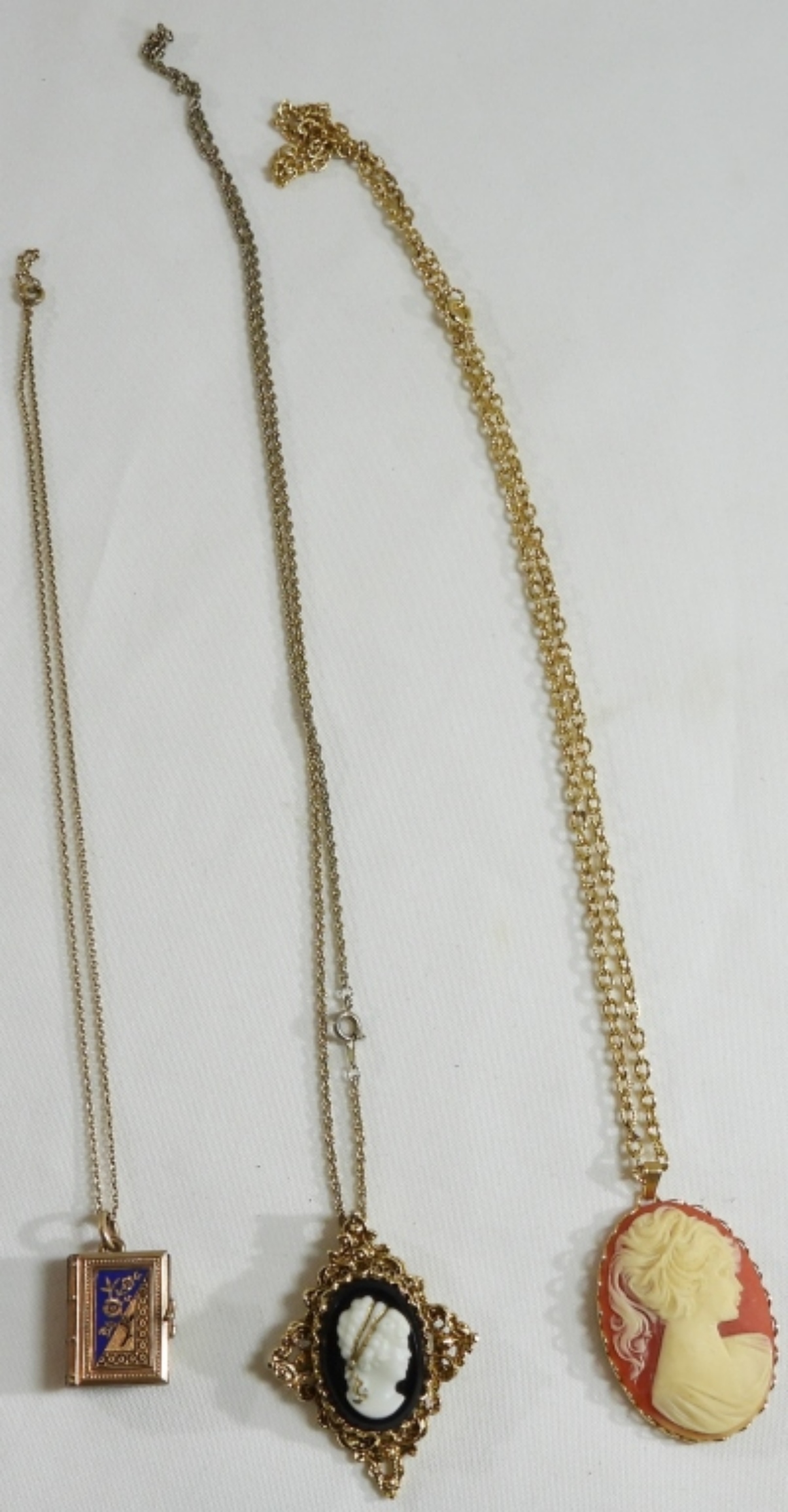 All gold-tone. 1) It is a 4-photo book locket. 2) is a black and white cameo 3) Is a red and white cameo