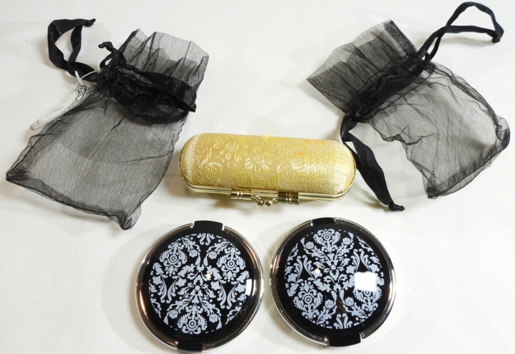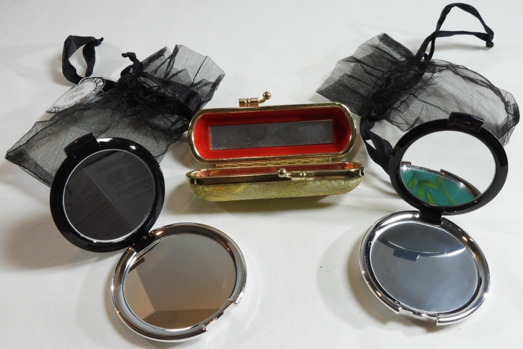 Black, white, and chrome mirrors. And a gold lipstick case with a mirror