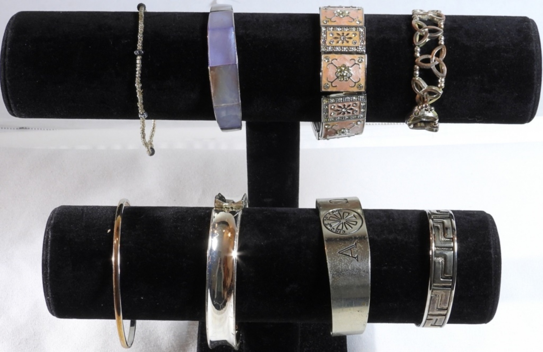 All silver tone, Irish Trinty Knot and pink stretchy band among others