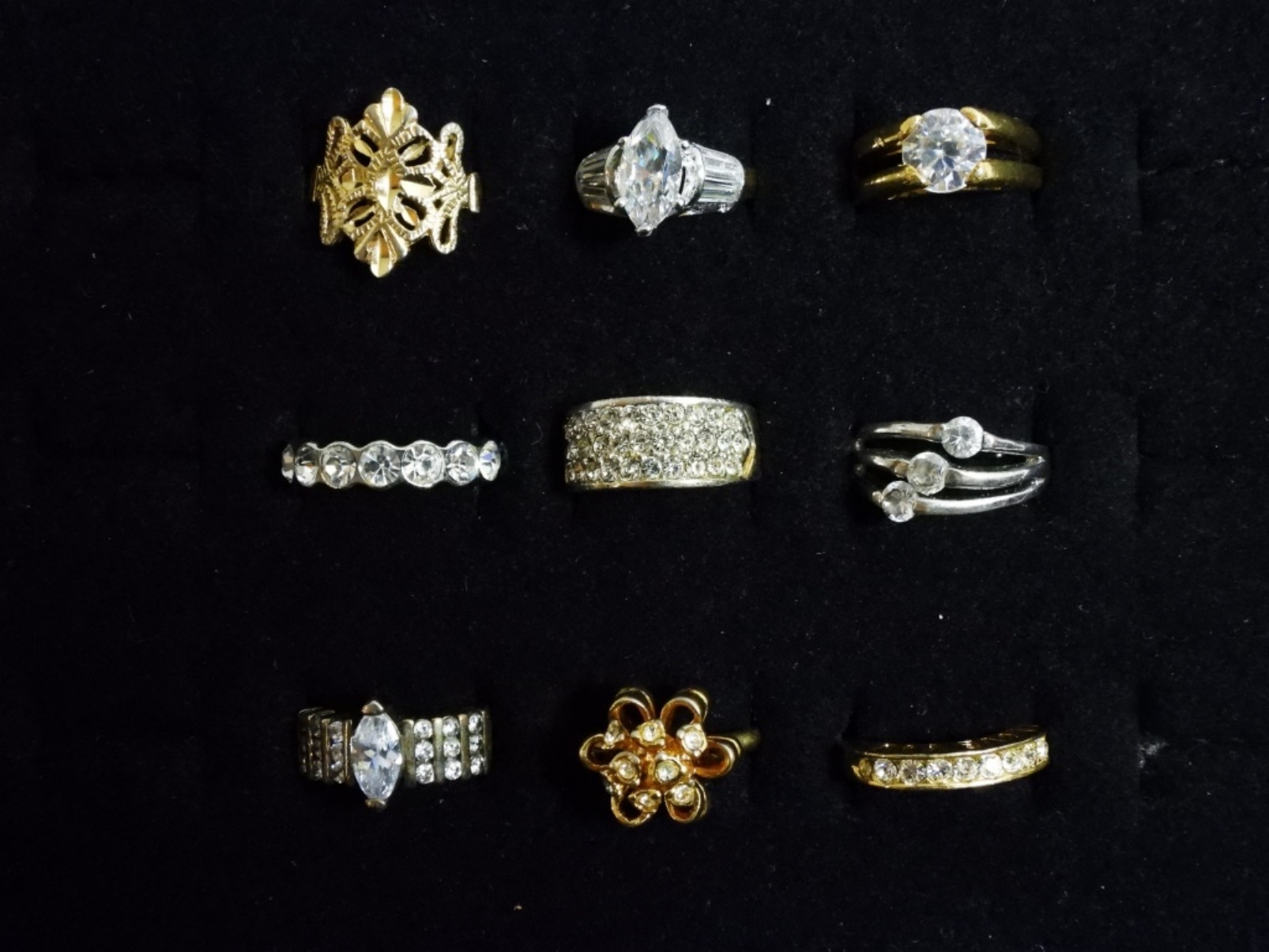 9 women’s gold and silver-tone rings in various sizes, such as 6, 7, 7 1/2, and 8.