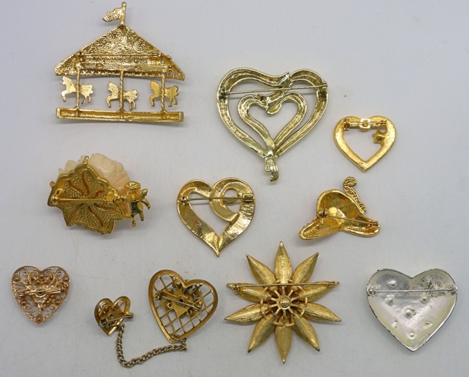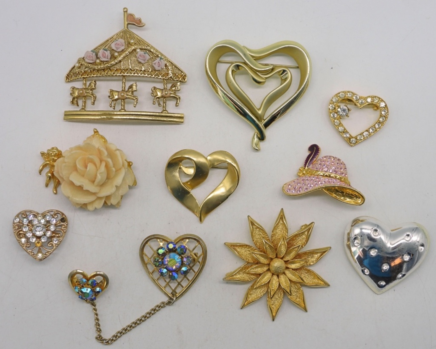6 beautiful hearts, different sizes, mostly gold tone, some flowers and more