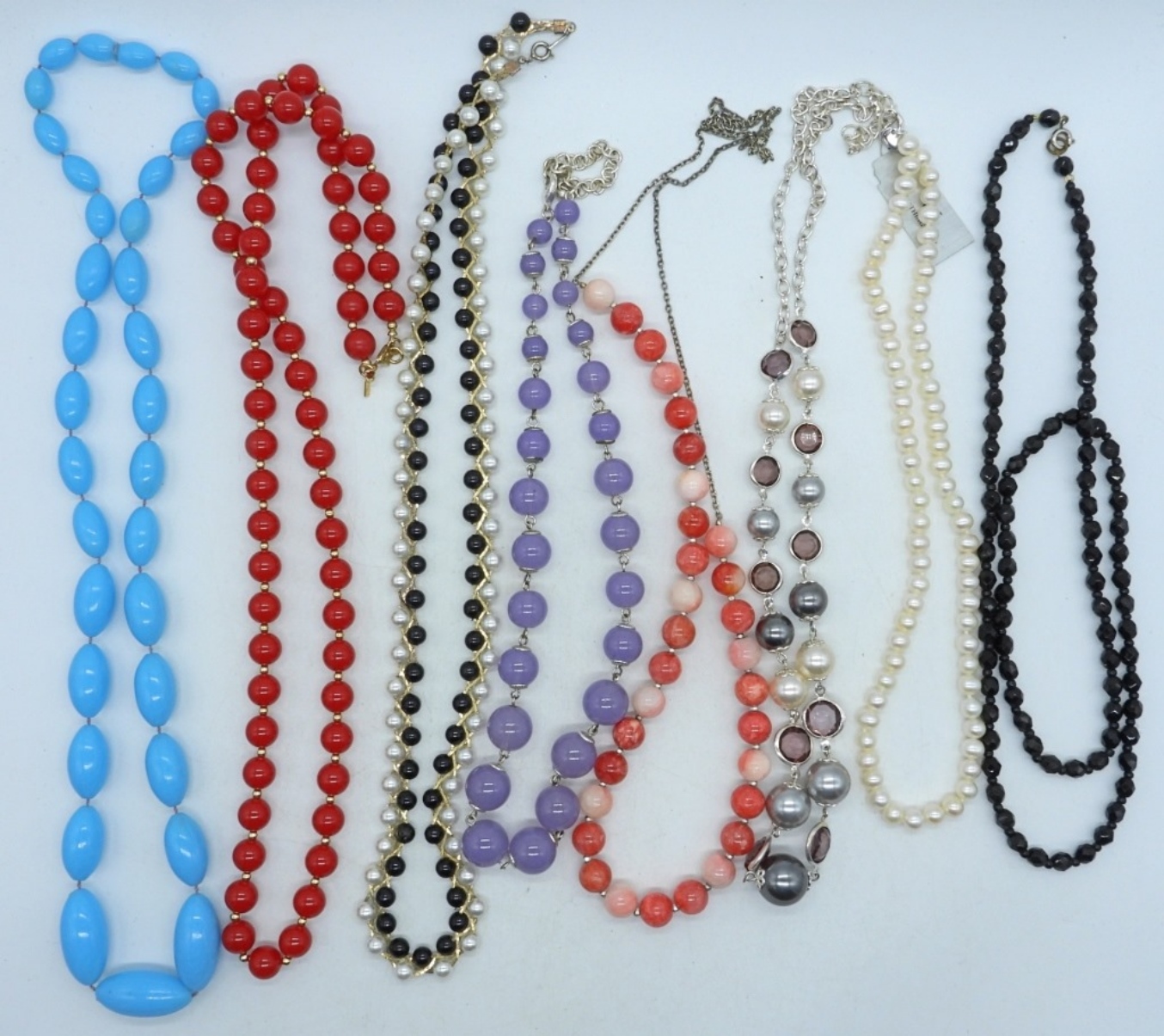 30″, 18″, 24″, 19″, 24″, 28″, 28″, and 24″, different colors and types of beads