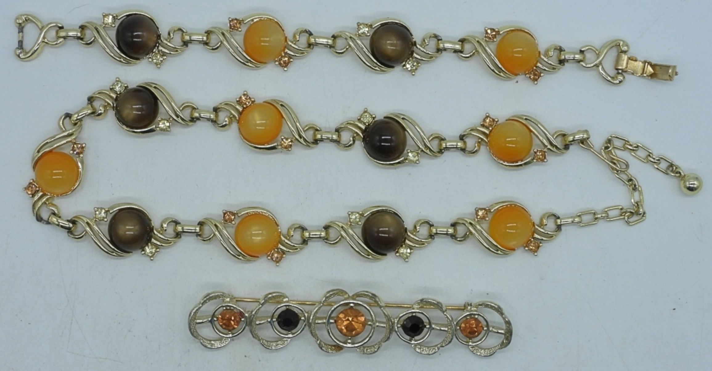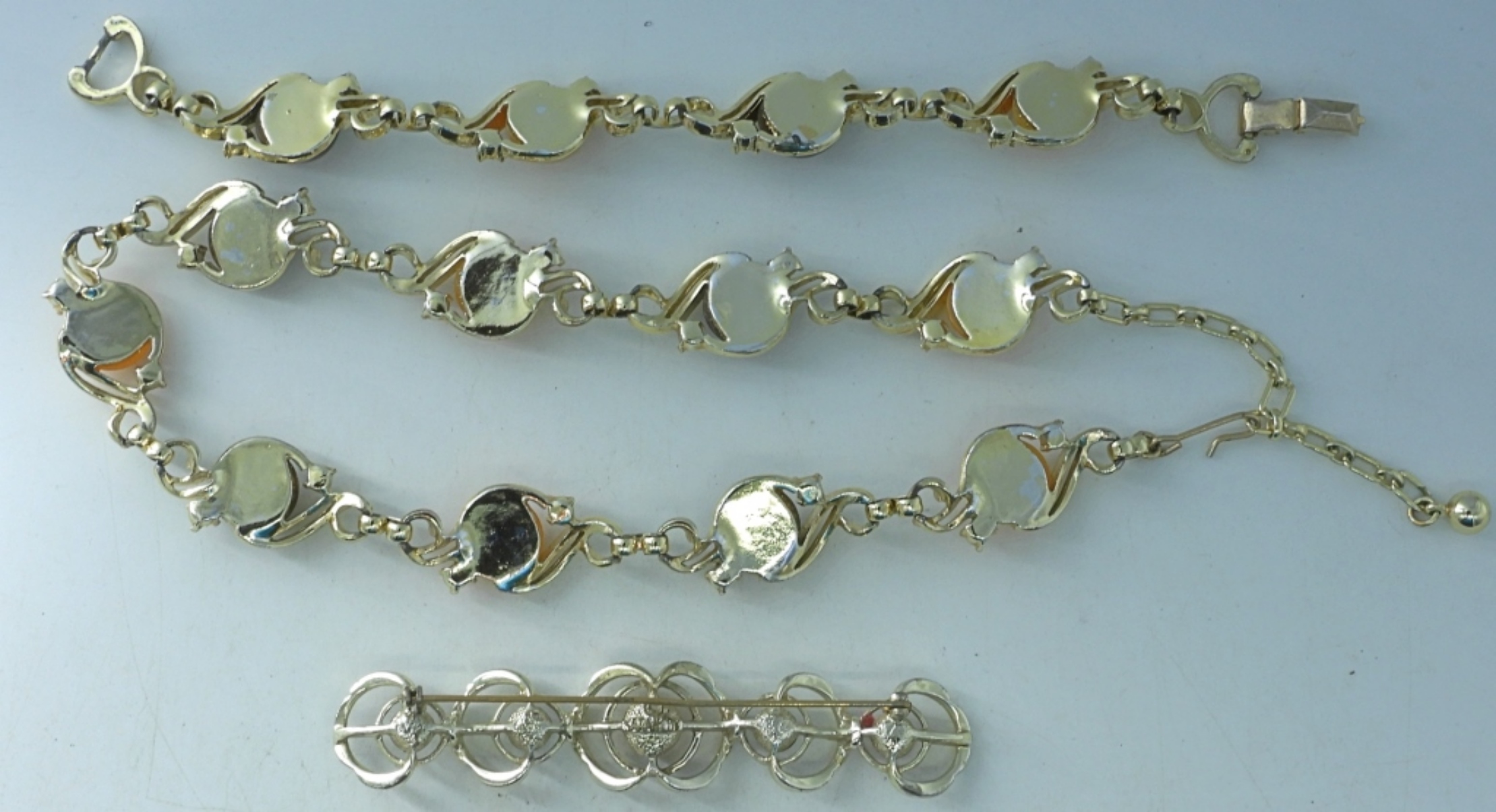 gold tone matching 14″ bracelet, 30″ necklace, and pin