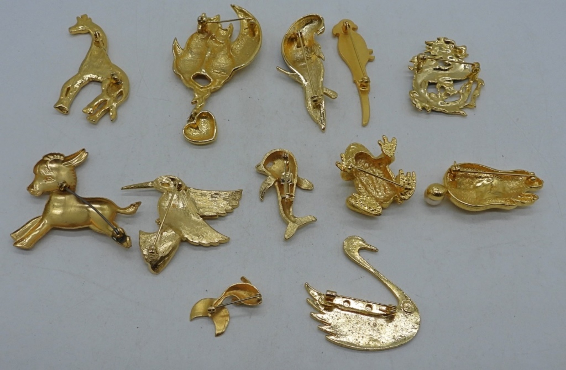 gold tone pins, lots of animals, including parrots, rabbit, frog, and more