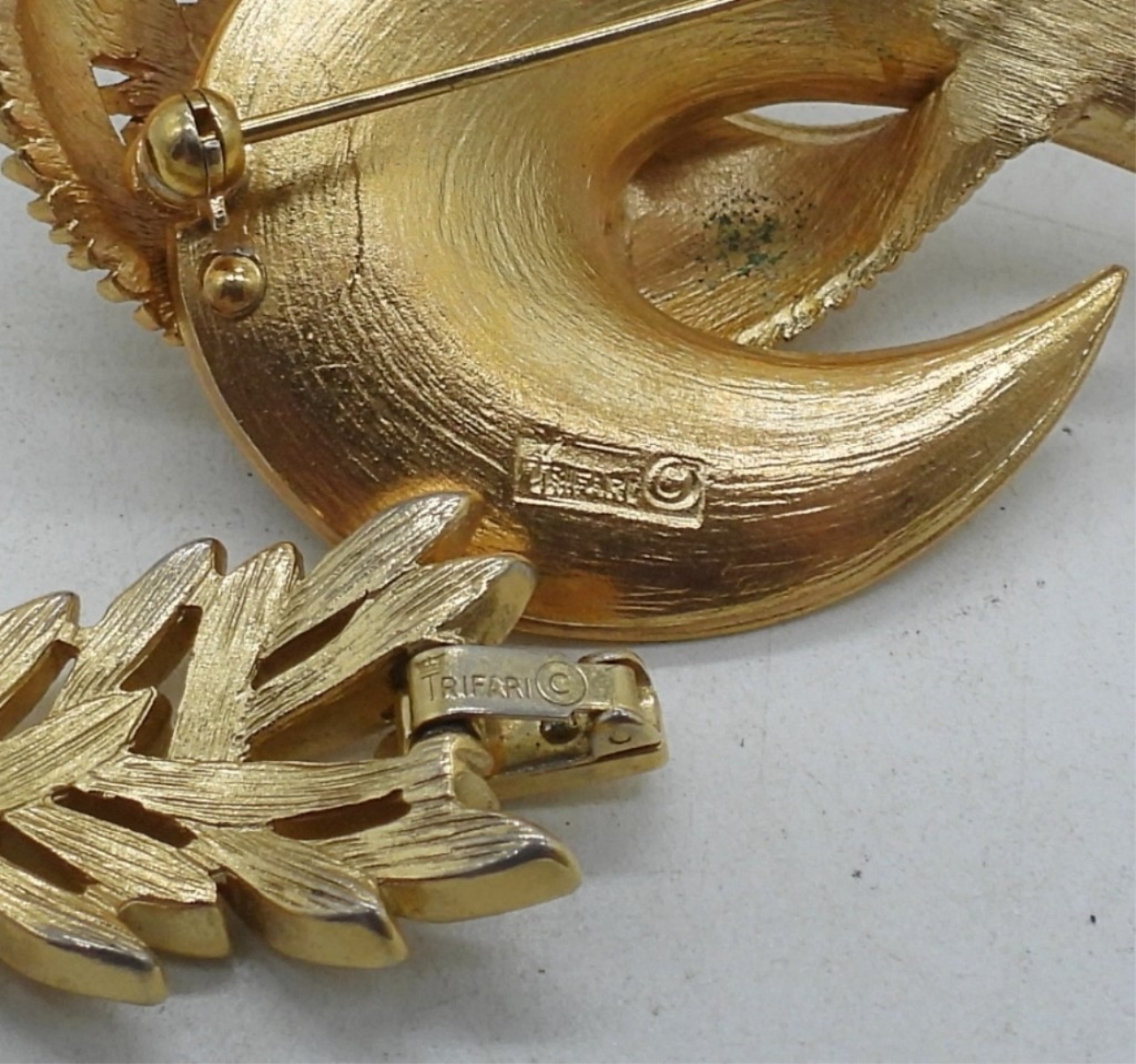 7 1/2″ bracelet with gold tone feather design, and 2 1/2″ gold tone brooch