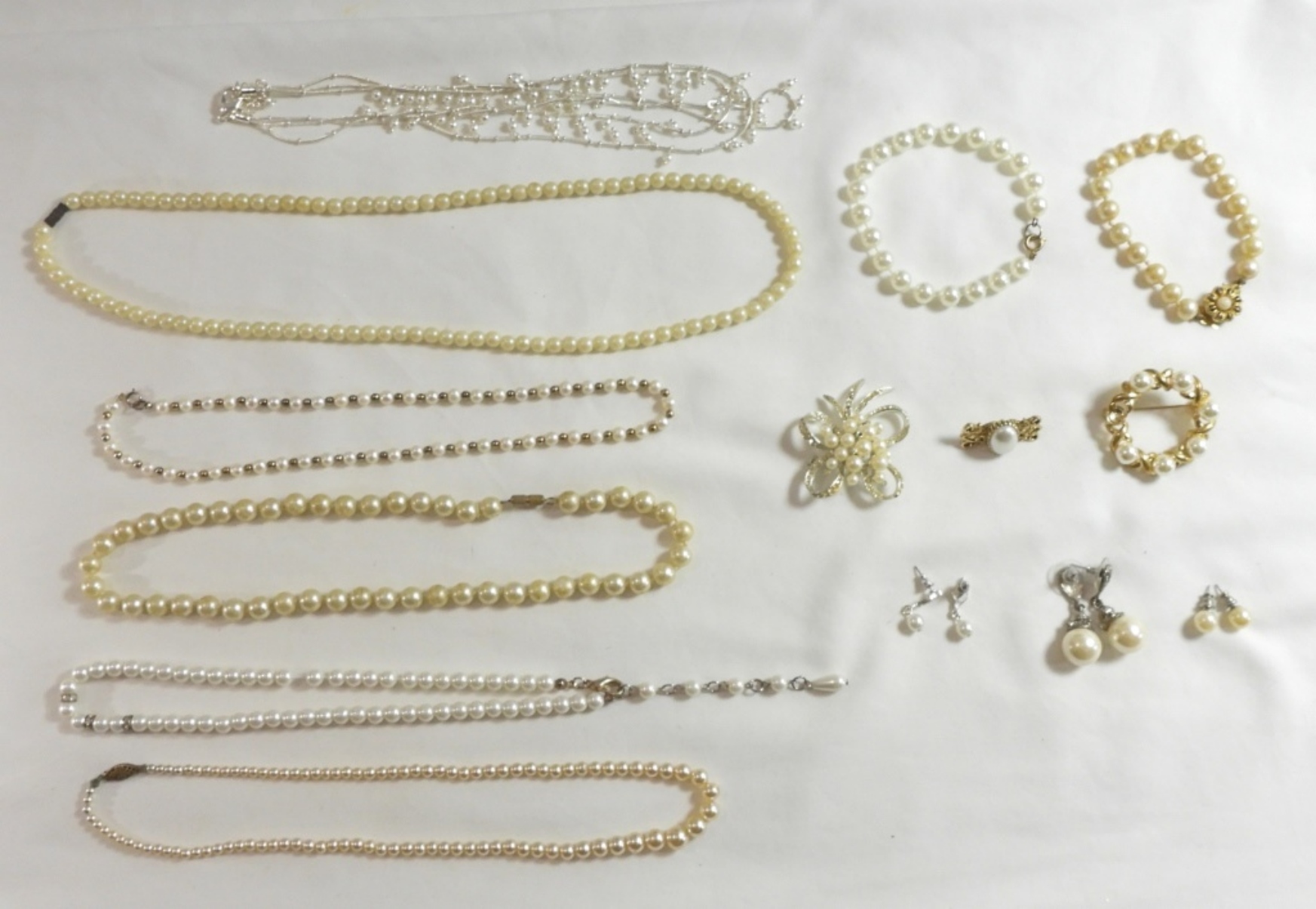 All pearls are faux, 6 necklaces, 2 bracelets, 3 pins, 3 earrings