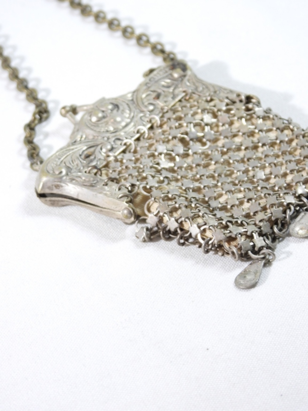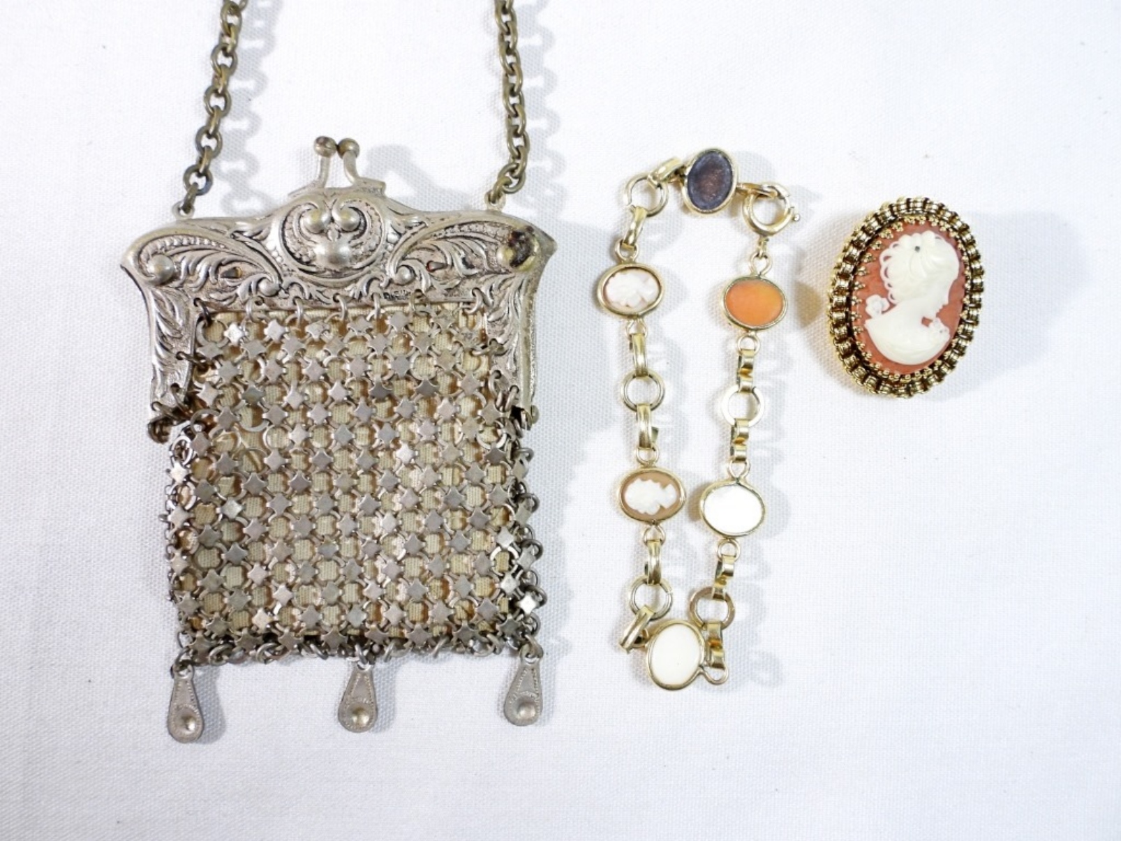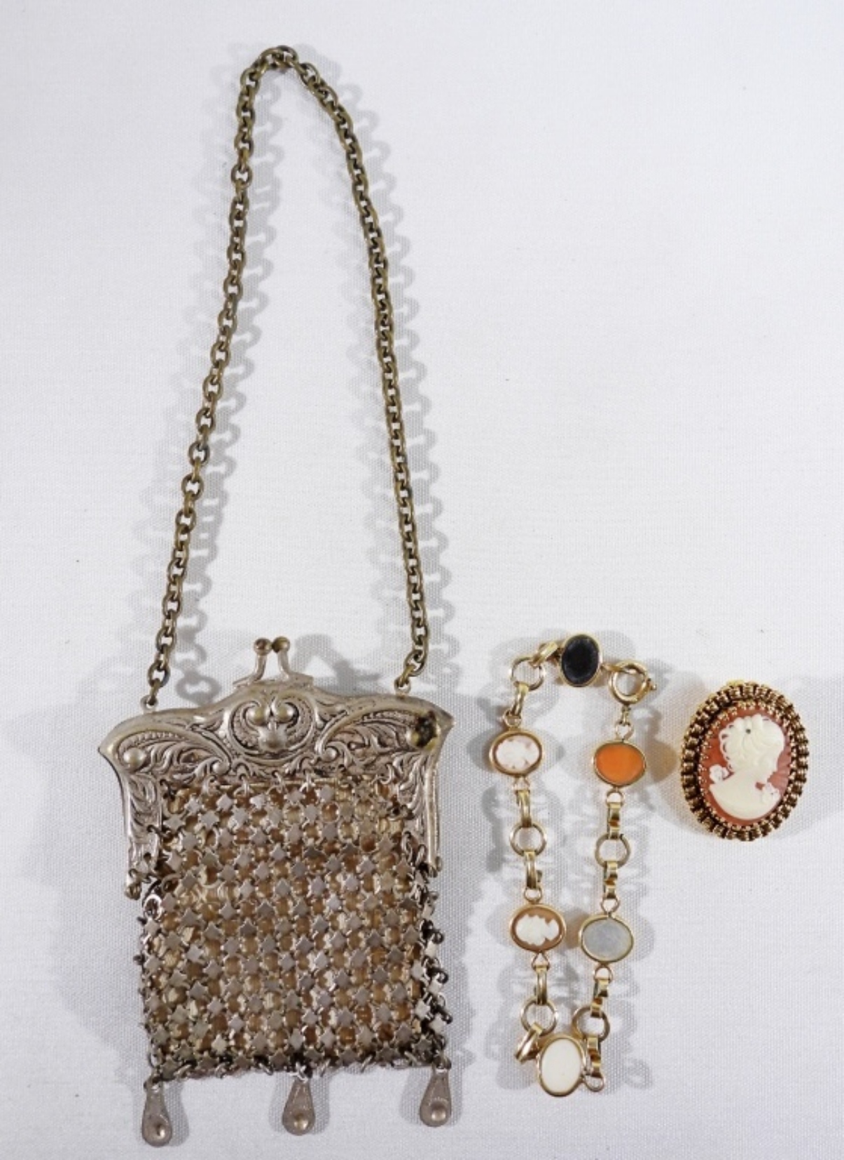 An antique Victorian silver-toned chain mesh coin purse with a finger clasp( from the bottom of the purse and the top of the chain is 8in, the bag is 2in wide, and the clutch part is 2 1/2 in. on its own), and a cameo