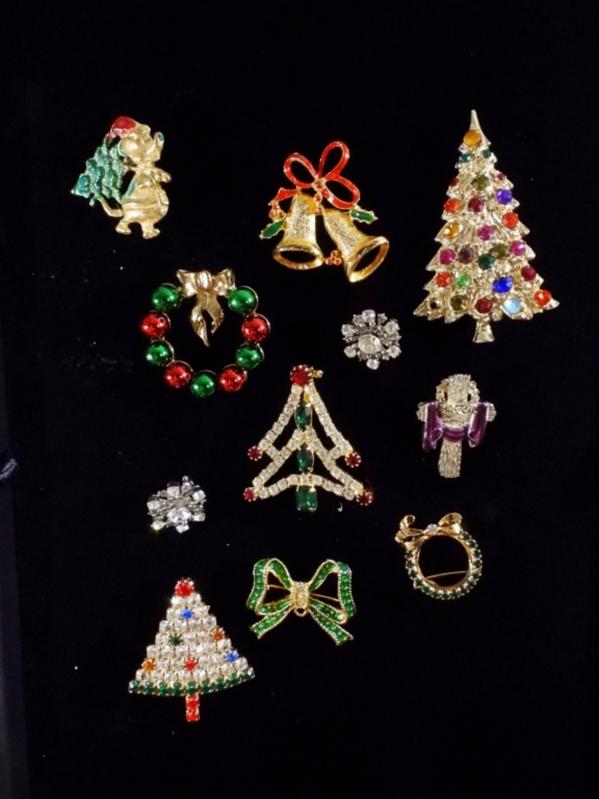 11 Christmas theme brooches, some Christmas trees brooches or wreaths, and more.