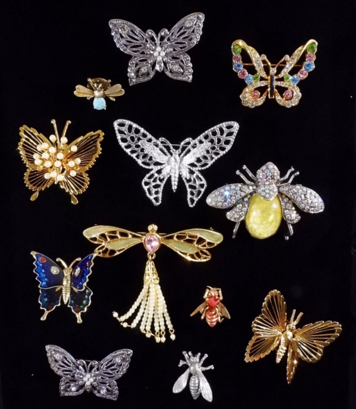 12 bug brooches, some butterfly brooches, a bee, and more.