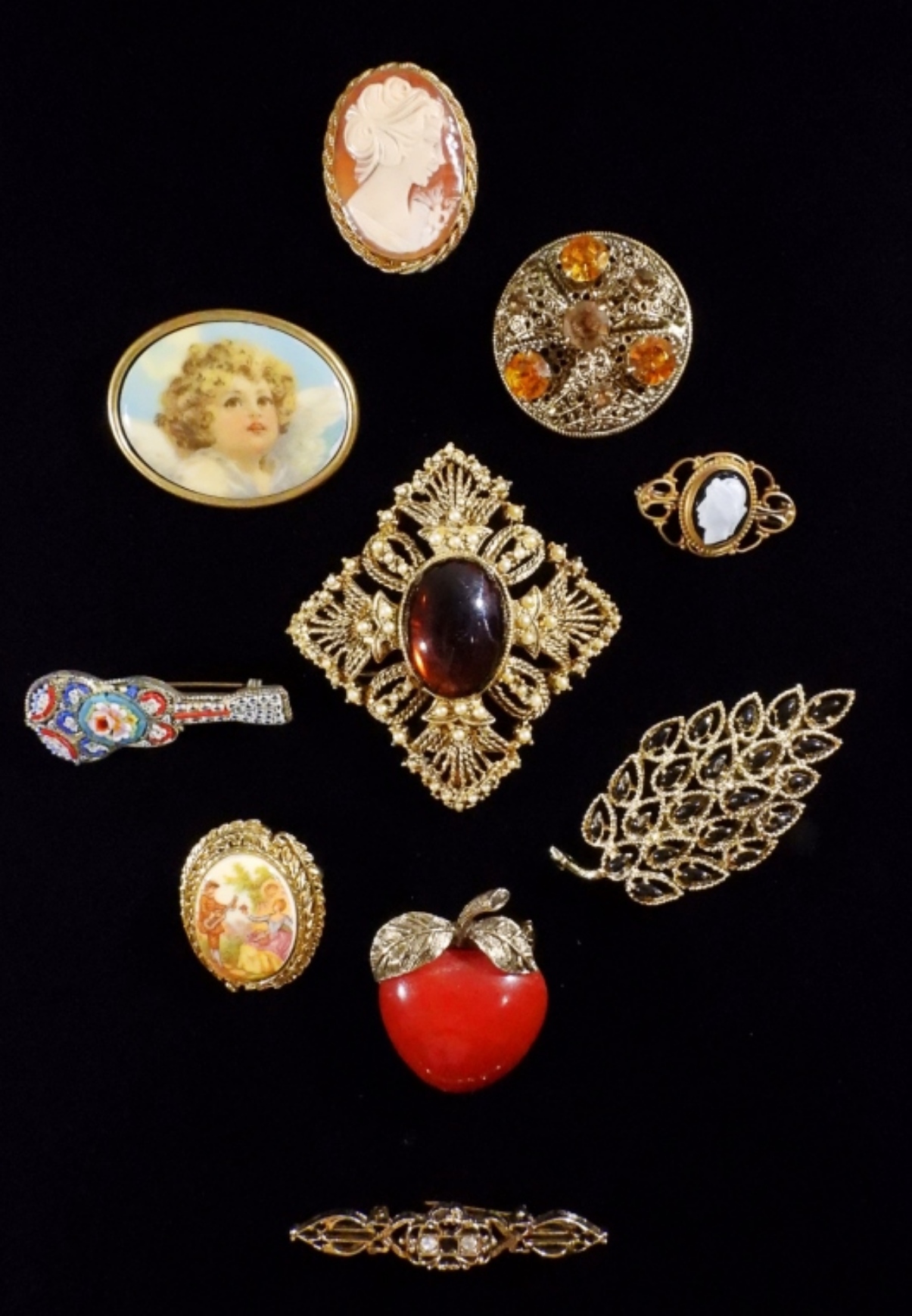 Mixed vintage brooch lot (10 brooches), such as a cameo brooch and other vintage-looking brooches.