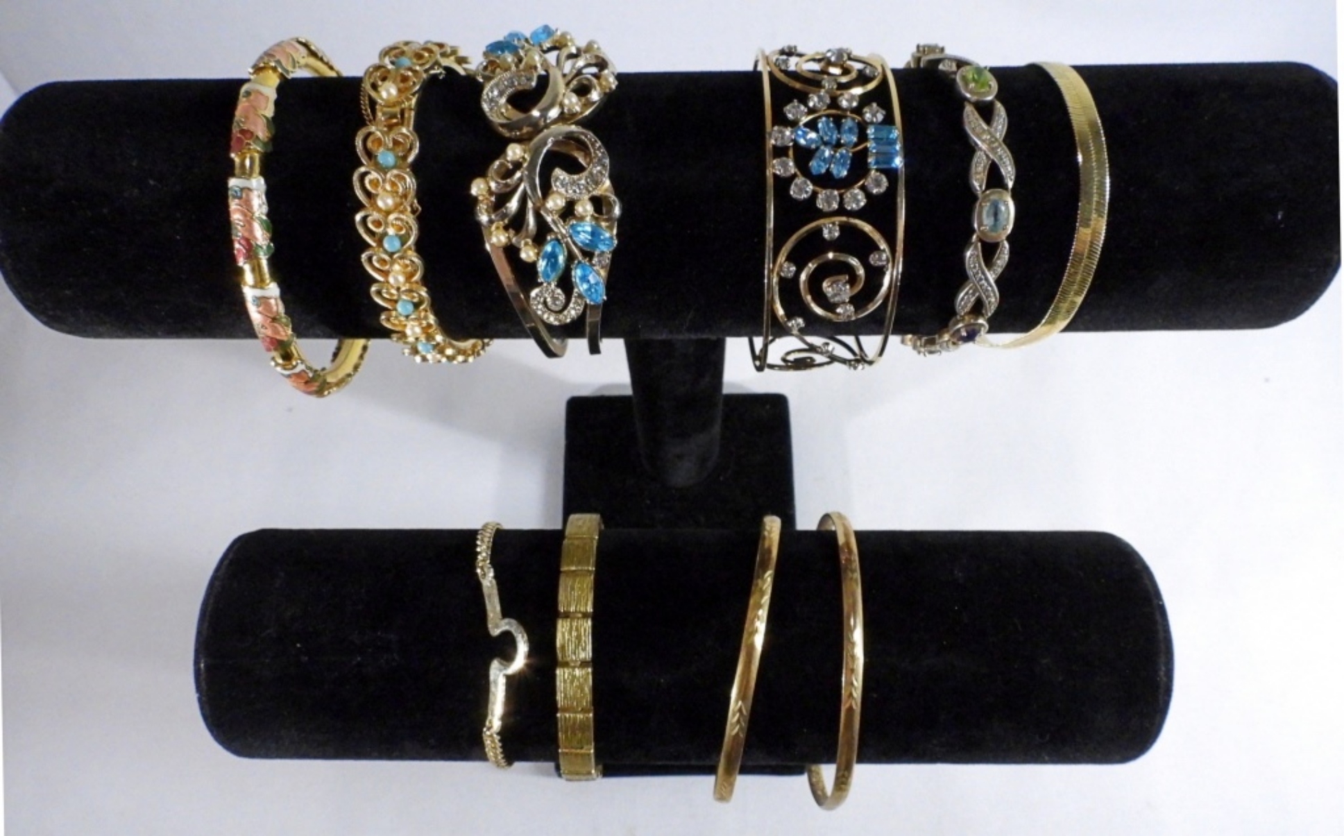 10 women’s fashion bracelets, mostly gold-tone, but there are others