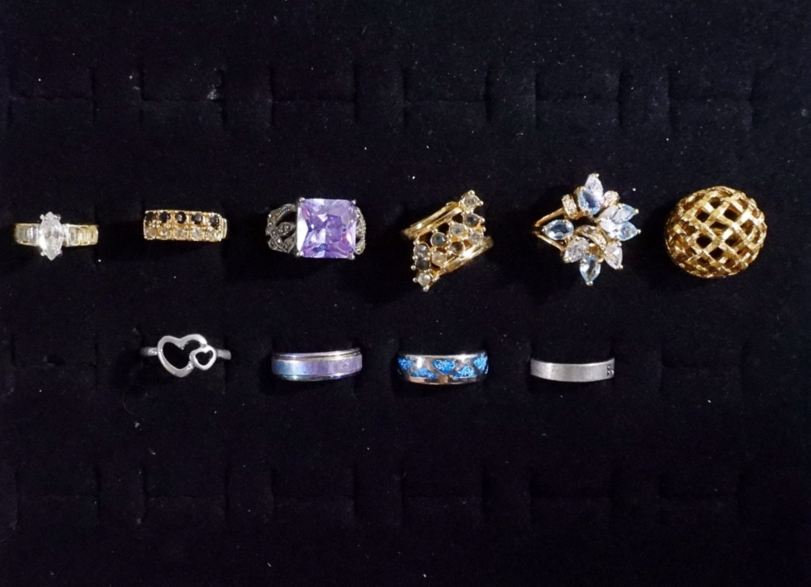 10 ladies fashion rings in sizes 6, 7, 7 1/2, 8, 8 1/2, 9.