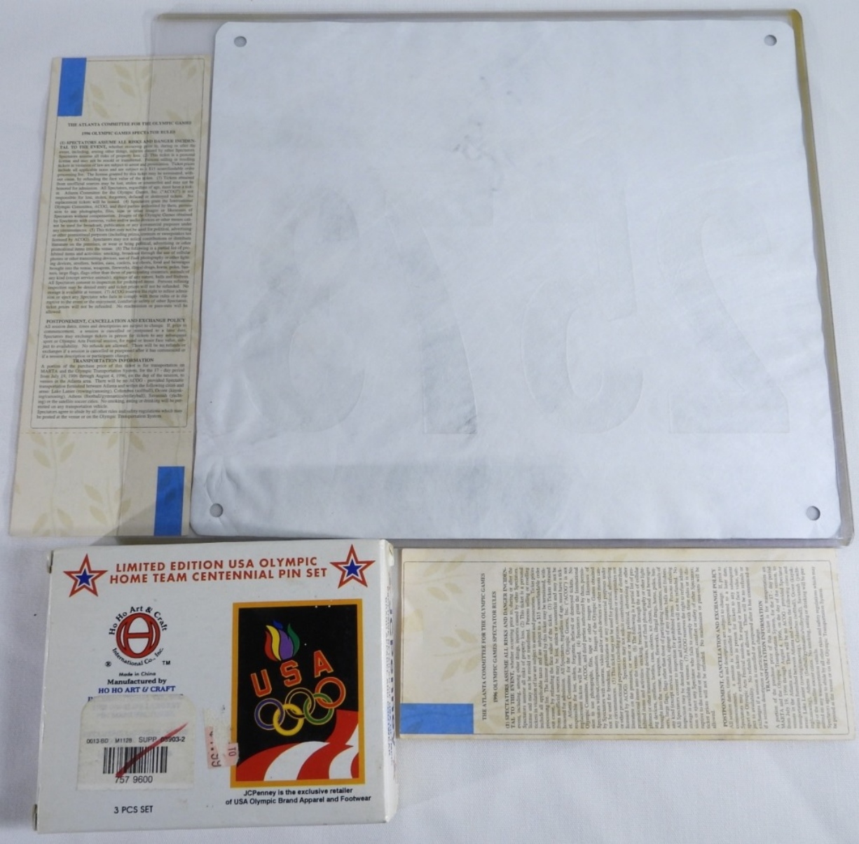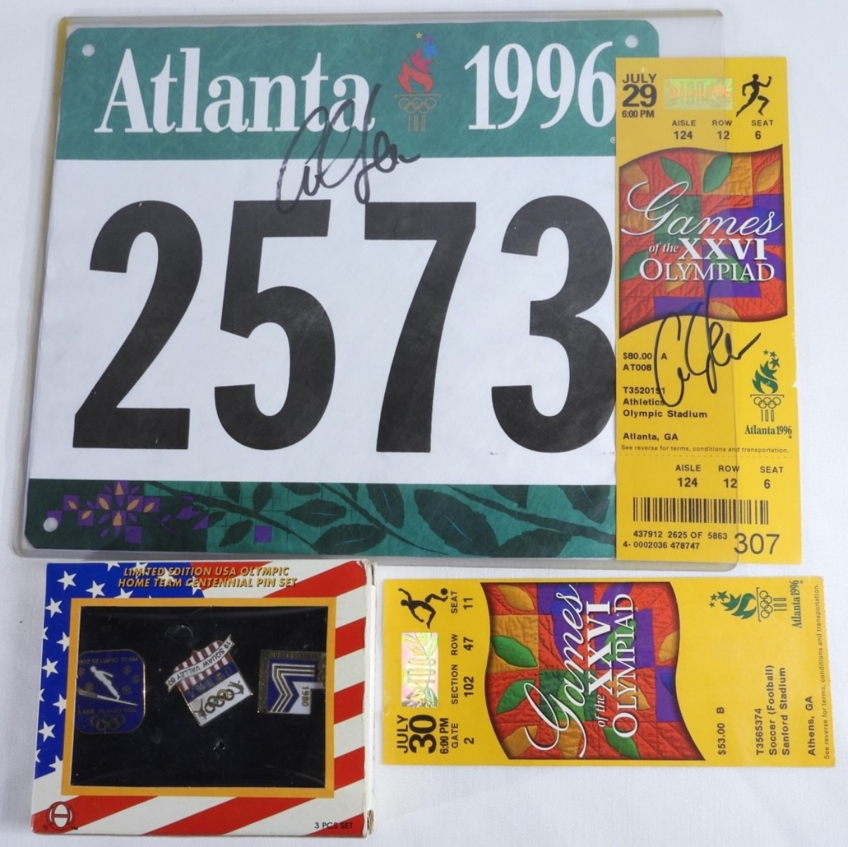 Carl Lewis 2573 Race bib and ticket. Both signed, but no COA. Another ticket and a JC Penney 3-pack of Limited Edition USA Olympic Home Team Centennial Pin Set