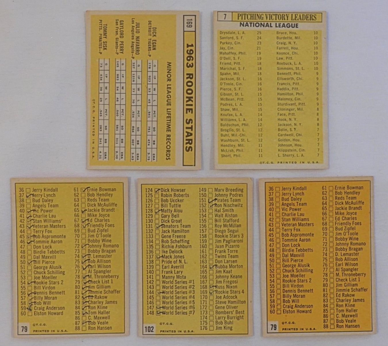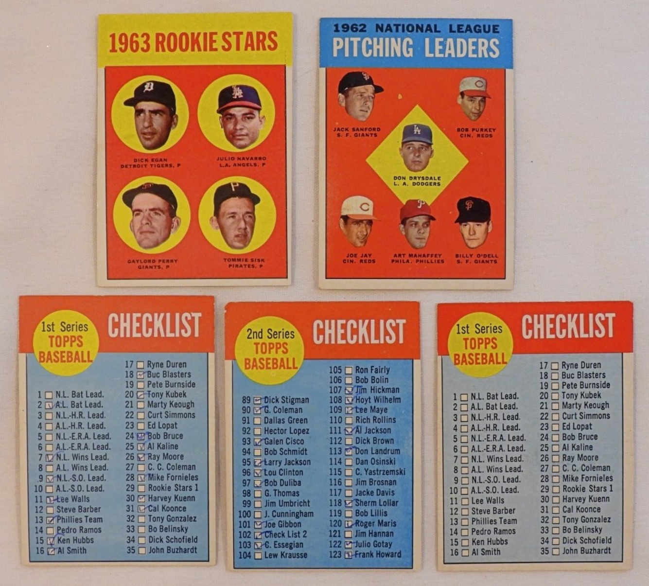 1963 Rookie Stars, 1962 National League Pitching Leaders, and 1963 team checklists with pen on two of them, good condition