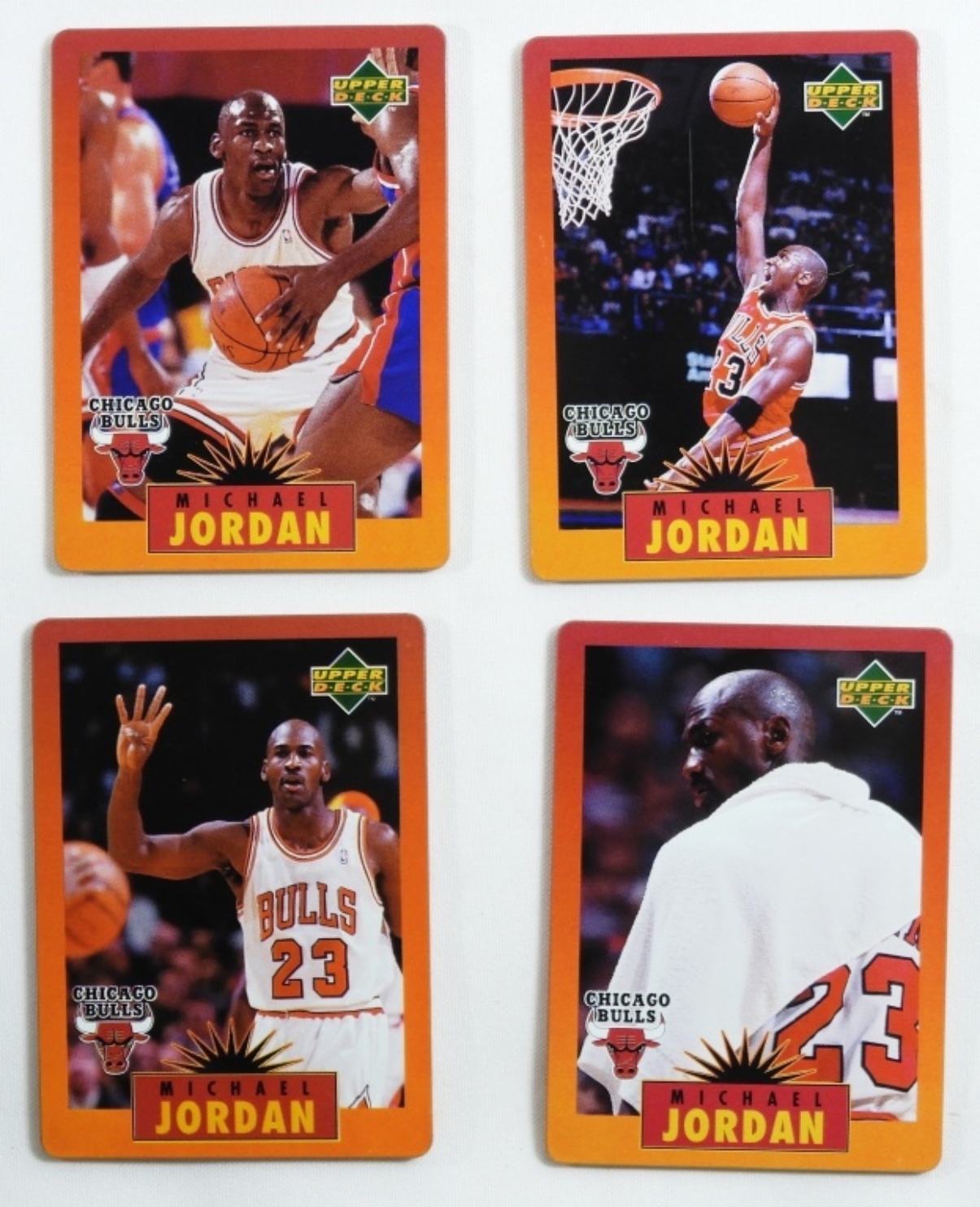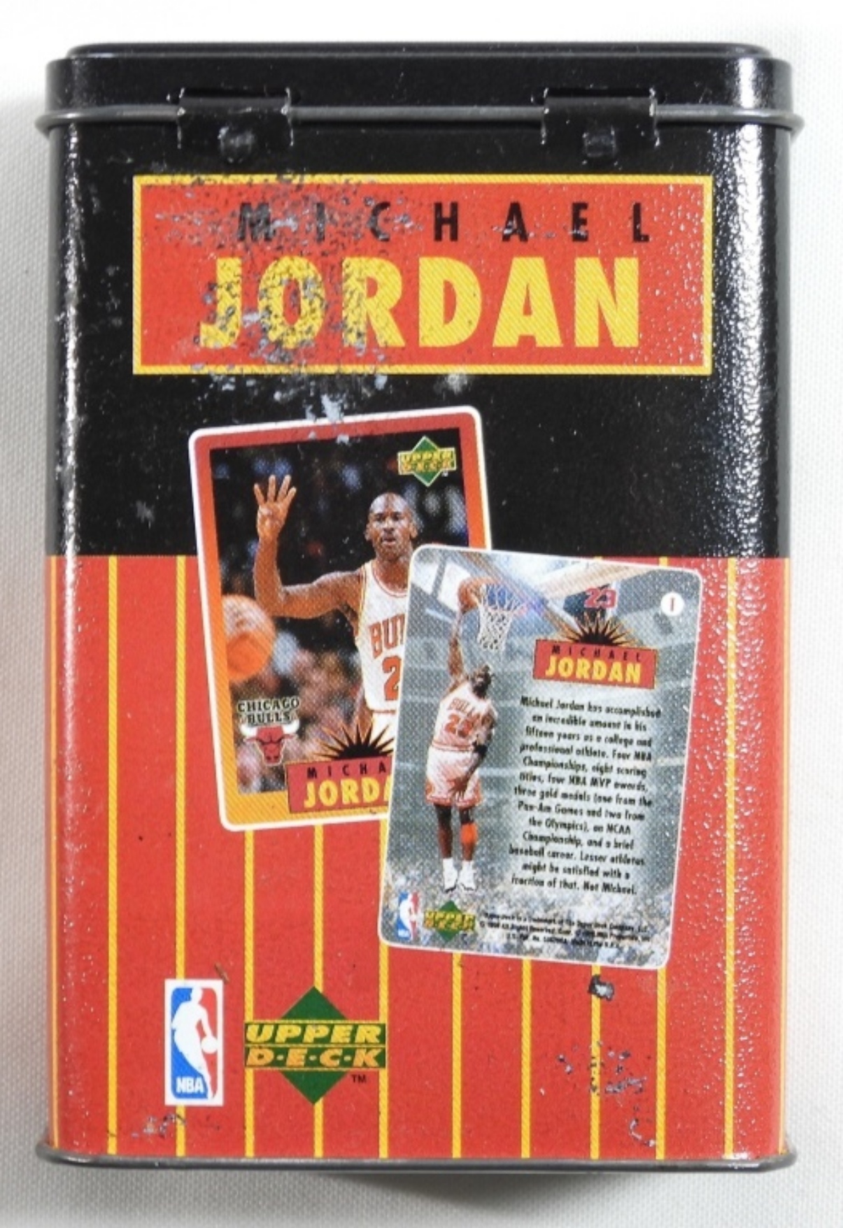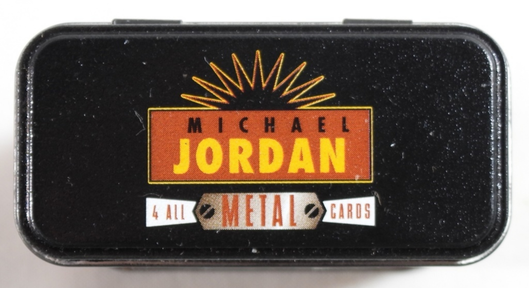 1996 Upper Deck Michael Jordan 4 all-metal cards and the container that the cards come in.