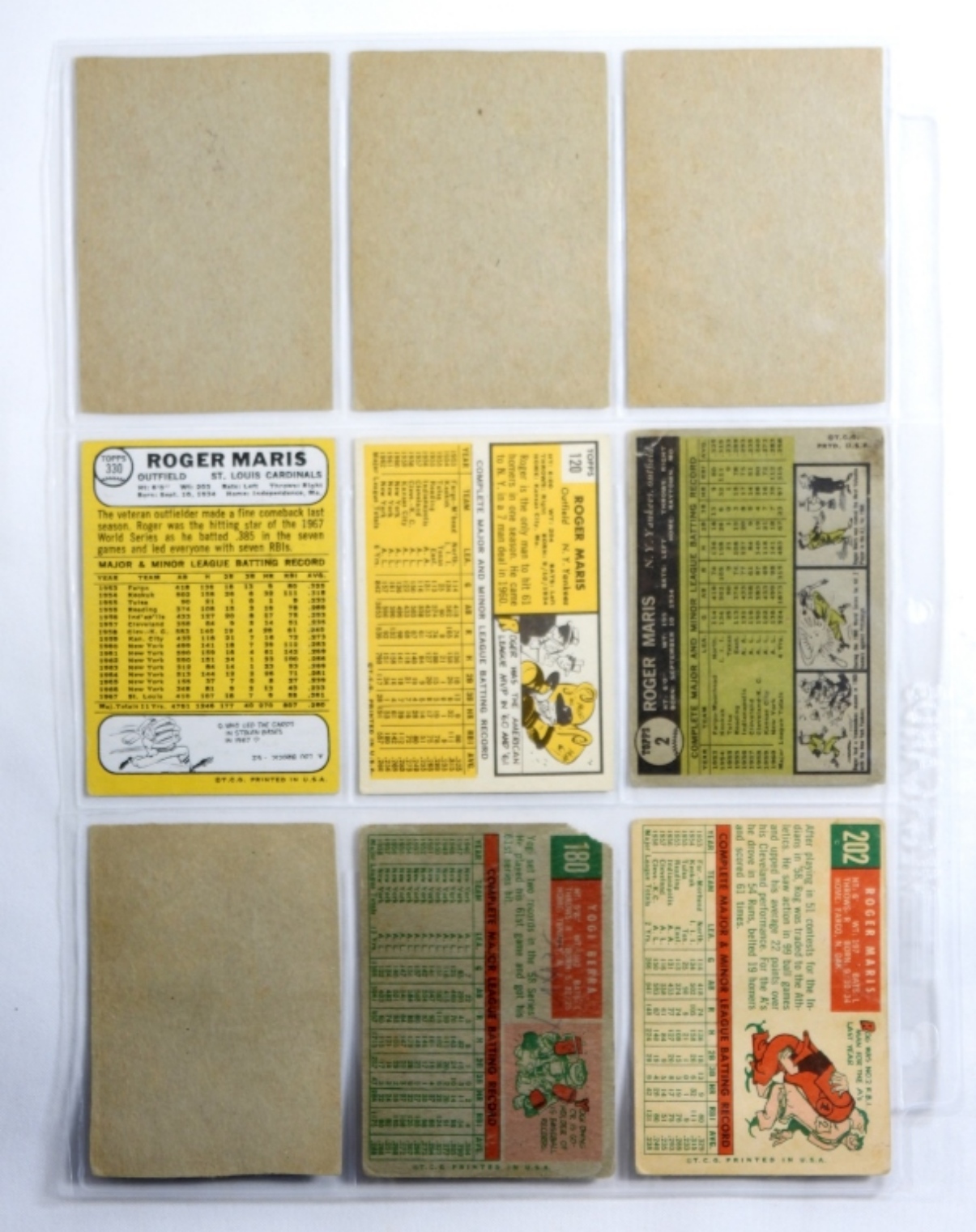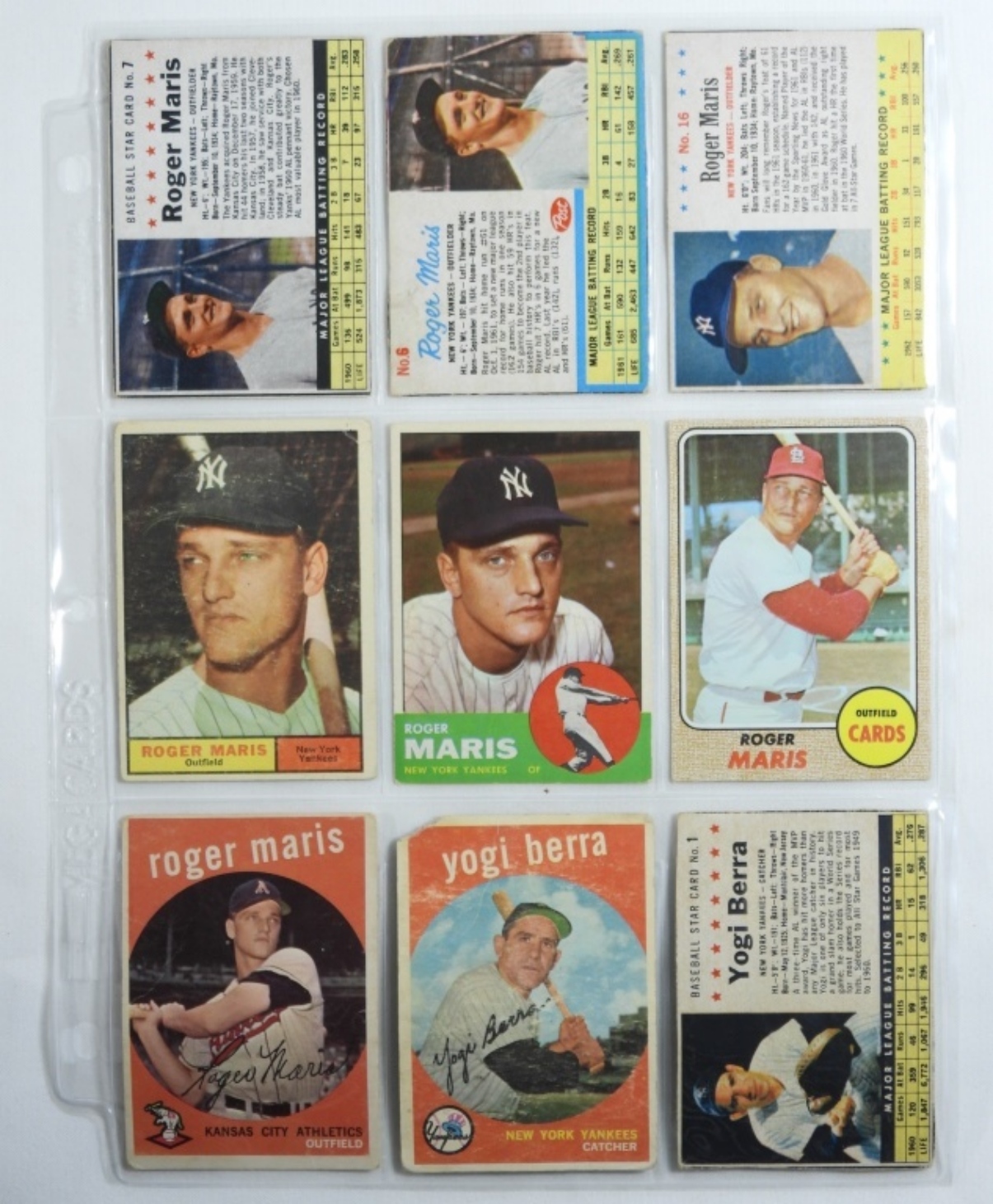 Roger Maris and Yogi Berra baseball cards set, some of the cards included are a Roger Maris TOPPS 120, a Yogi Berra 180 card, and more.