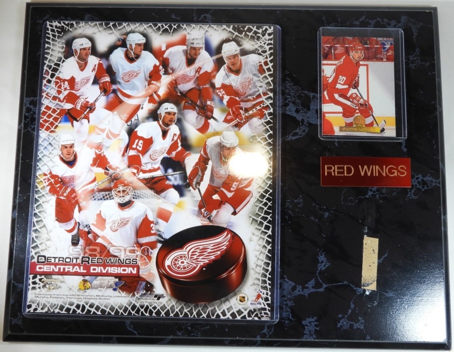 Plack Martin Lapointe card, and large photo with Shanahan, McCarty, Lidstrom, Murphy, Fedorov, Yzerman, Osgood, and Kozlov