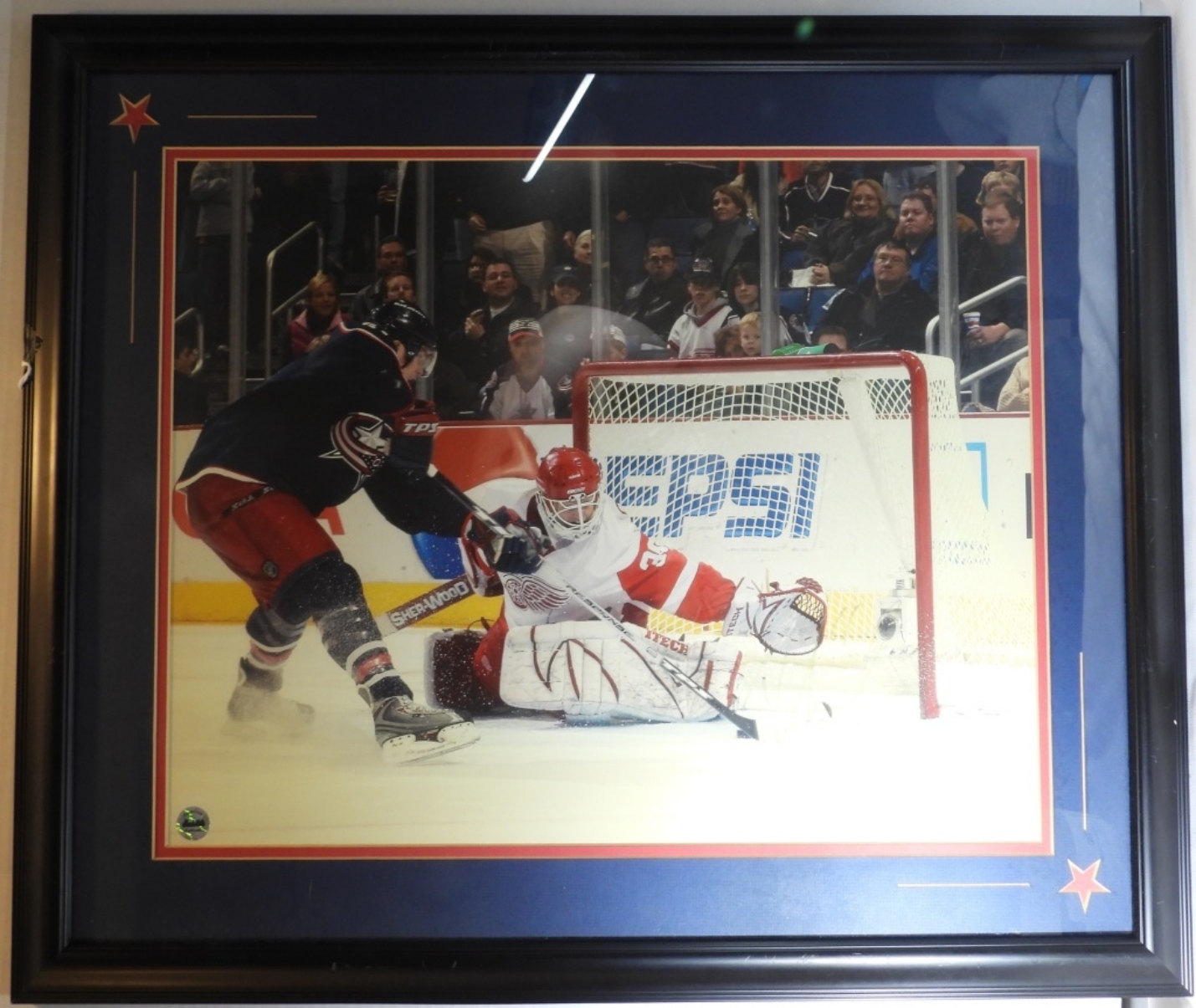 This large photo shows a Columbus Blue Jacket making a score against the Detroit Red Wings. Also has a Holographic sticker from GameTime Authentics