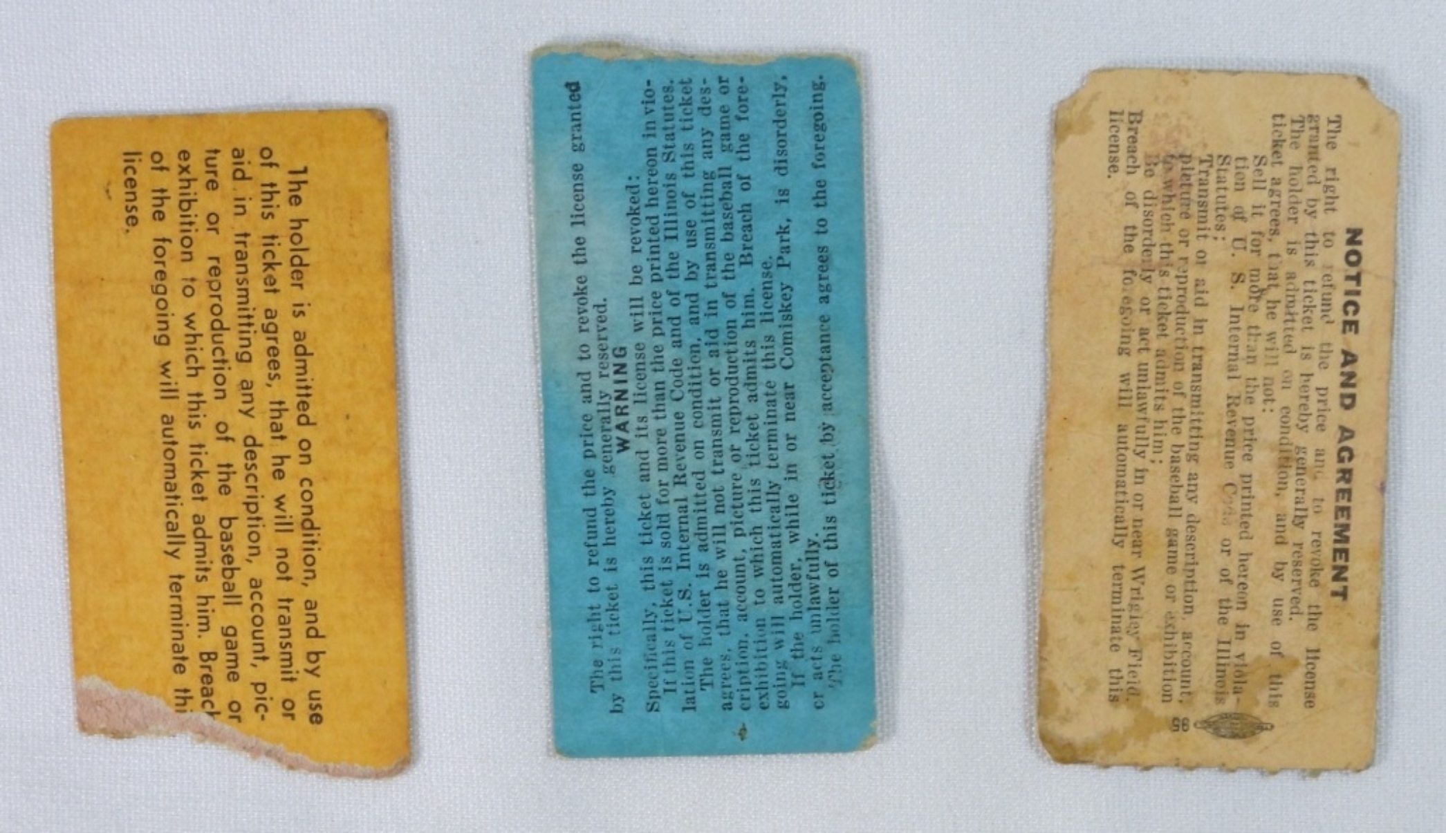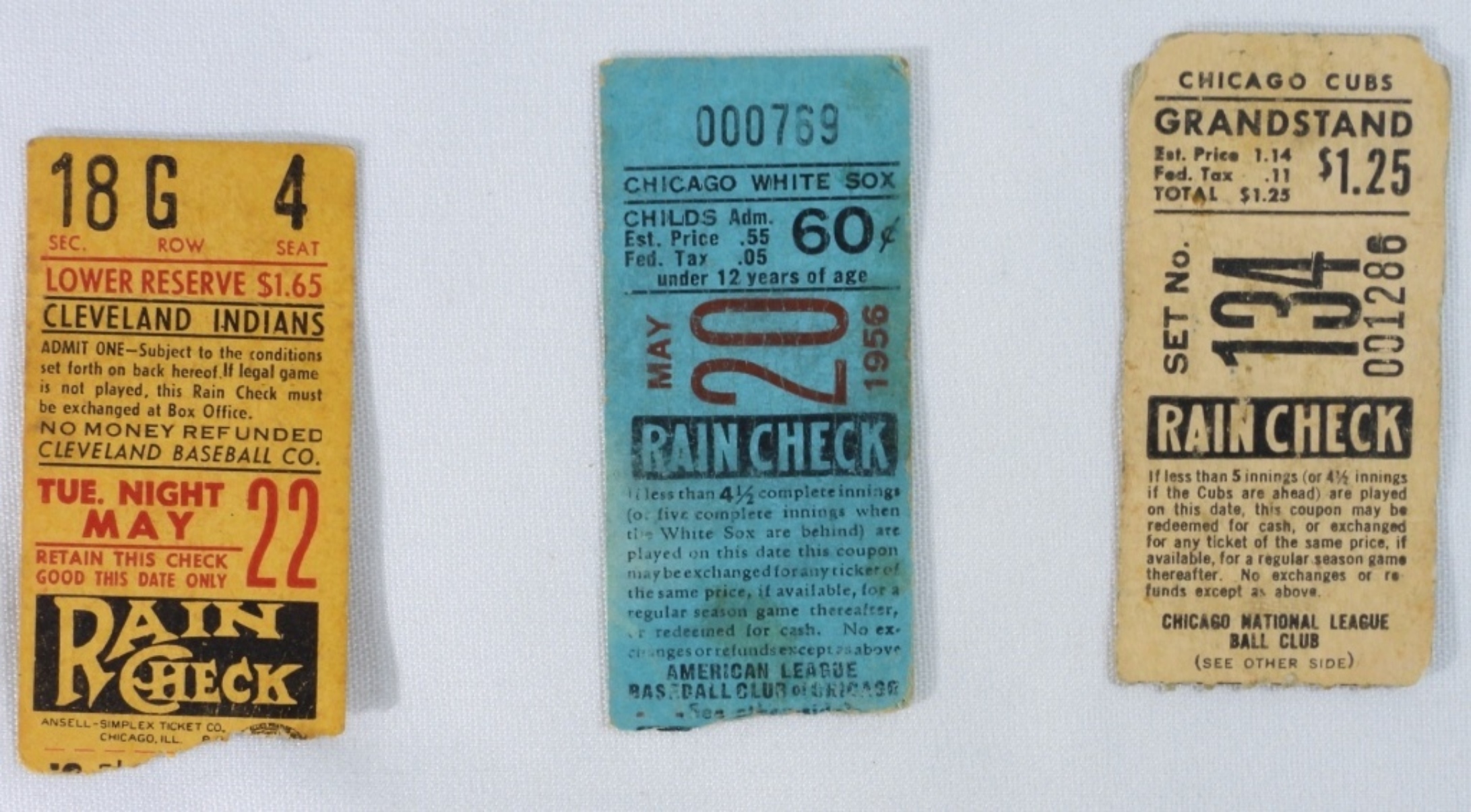 Mixed lot of 3 vintage baseball tickets some of which include a Cleveland Indians Tue. Night May 22 ticket, and a Chicago Cubs grandstands seat number 134, and more.