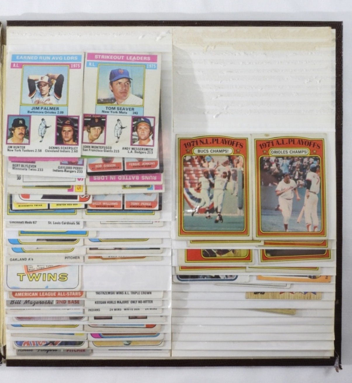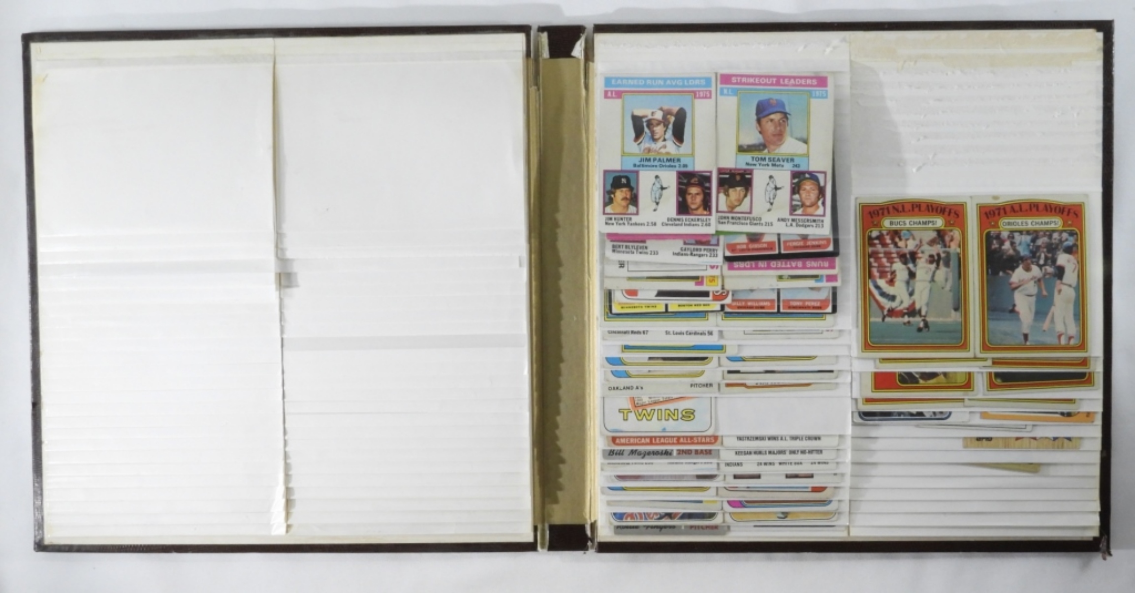 A mixed lot of baseball cards in a card book, which is not full and has some photo holders missing. Some cards included in the lot are John Roseboro, TOPPS #218, Tony Oliva #600, and more.