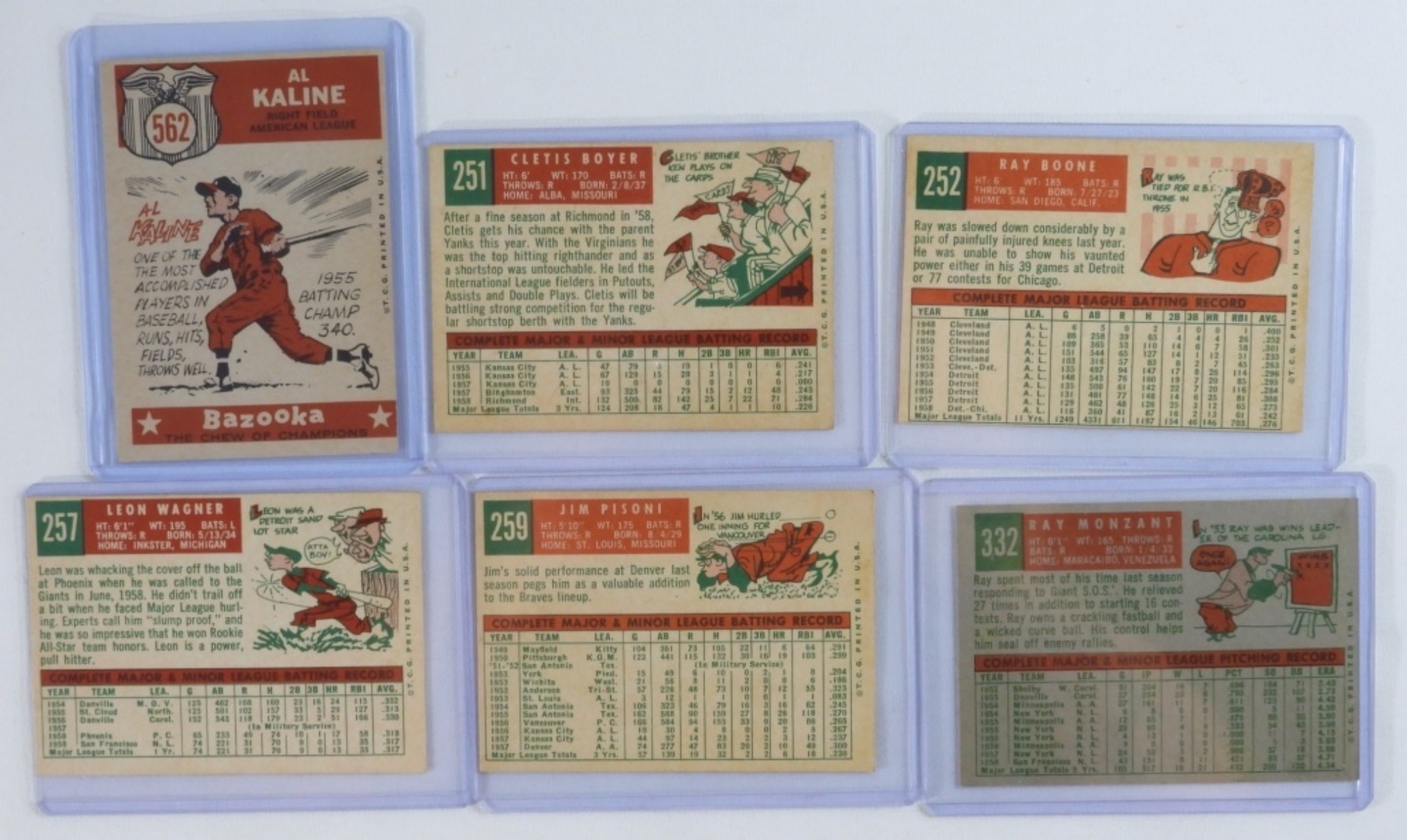 A mixed lot of 6 baseball cards, some of which include Al Kaline #562, Cletis Boyer #251, and more.