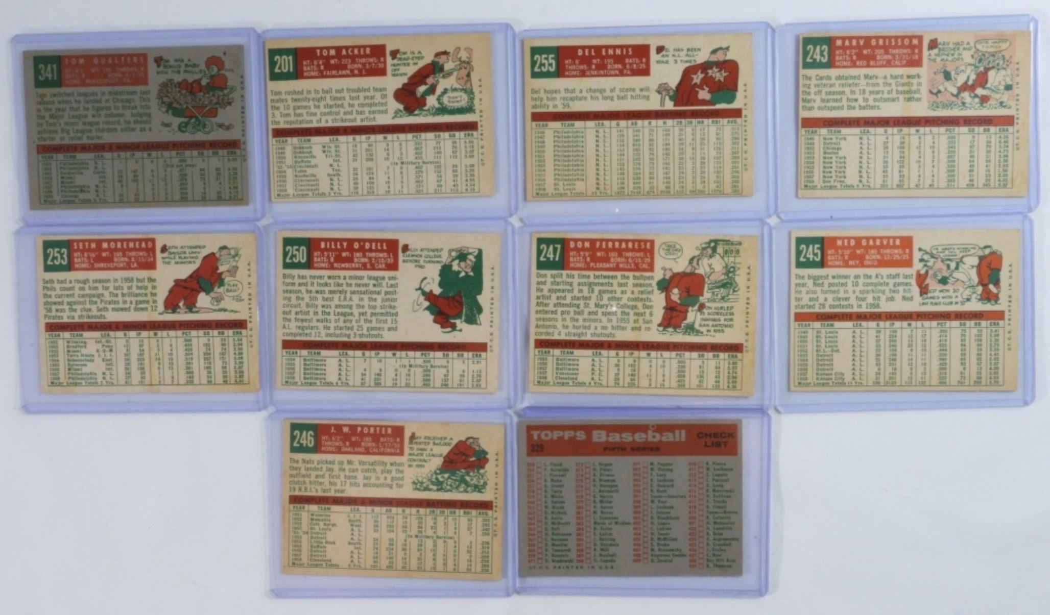 A mixed lot of 10 baseball cards, some of which include Tom Qualters #341, Tom Acker #201, and more.