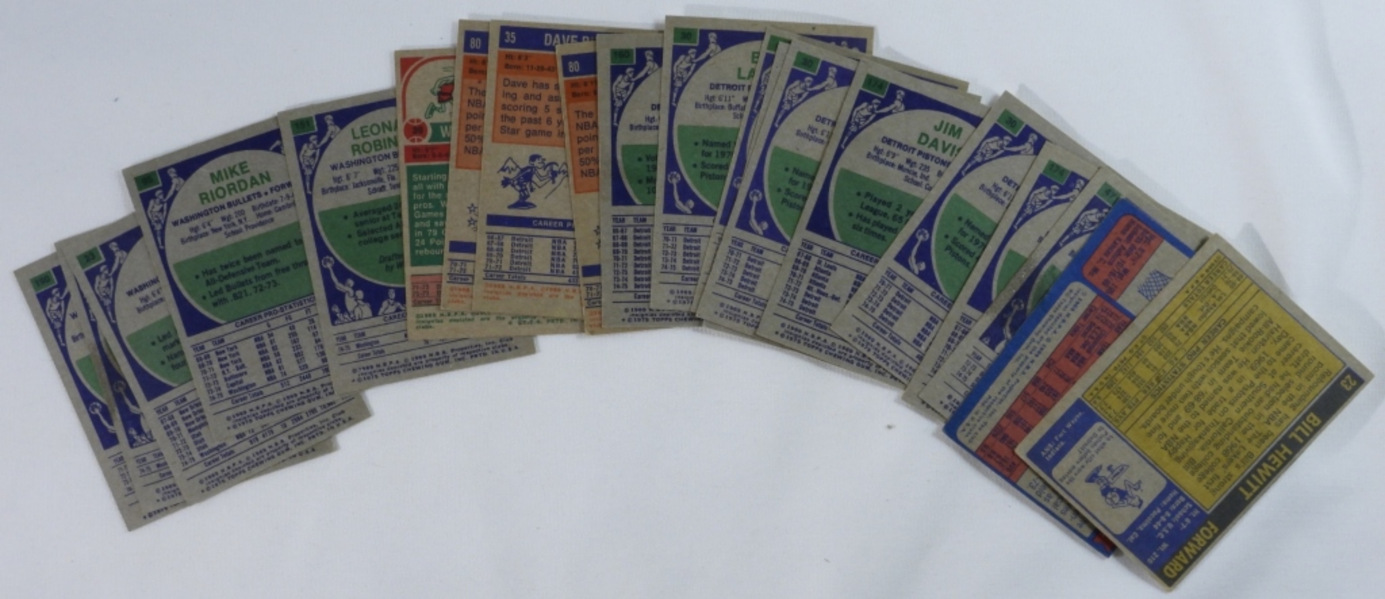 Mixed lot of 20 Bullets and Pistons basketball cards, some of which include Willie Norwood #39, Leonard Robinson #151, and more.