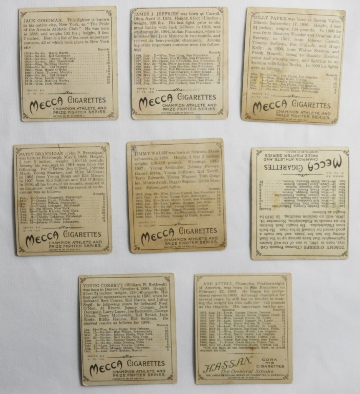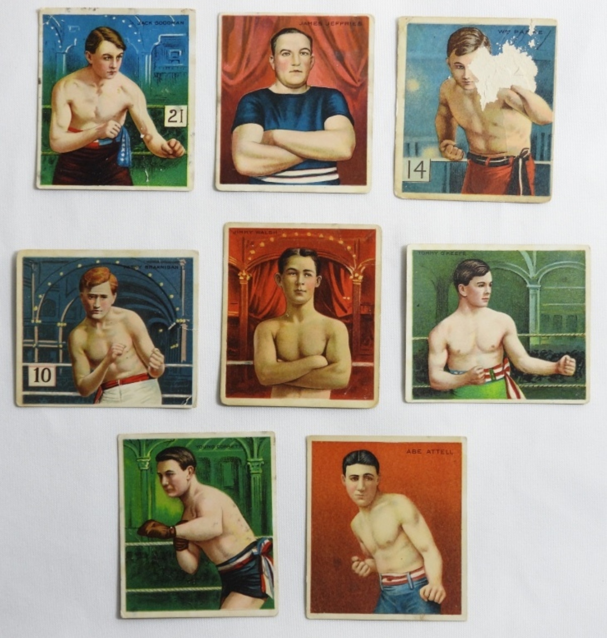 8 champion and prized fighter cards, cards which include a Jack Goodman No.30 card, a James J. Jeffries No.649 card, and more.