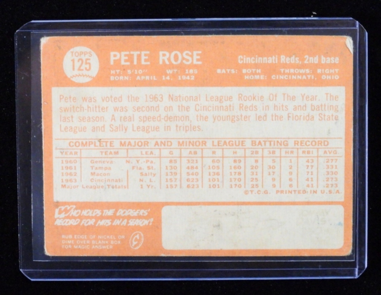 Pete Rose TOPPS #125 F, wear on the card, and all 4 corners are rounded and fuzzy.
