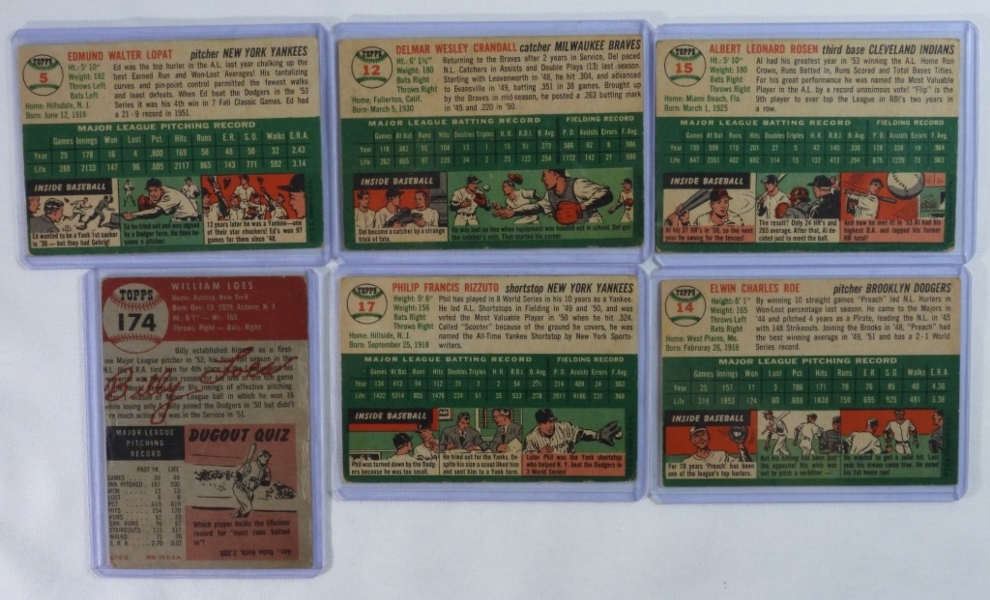 Mixed lot of 6 TOPPS baseball cards, some of which are Ed Lopat #5, Del Crandall #12, and more.