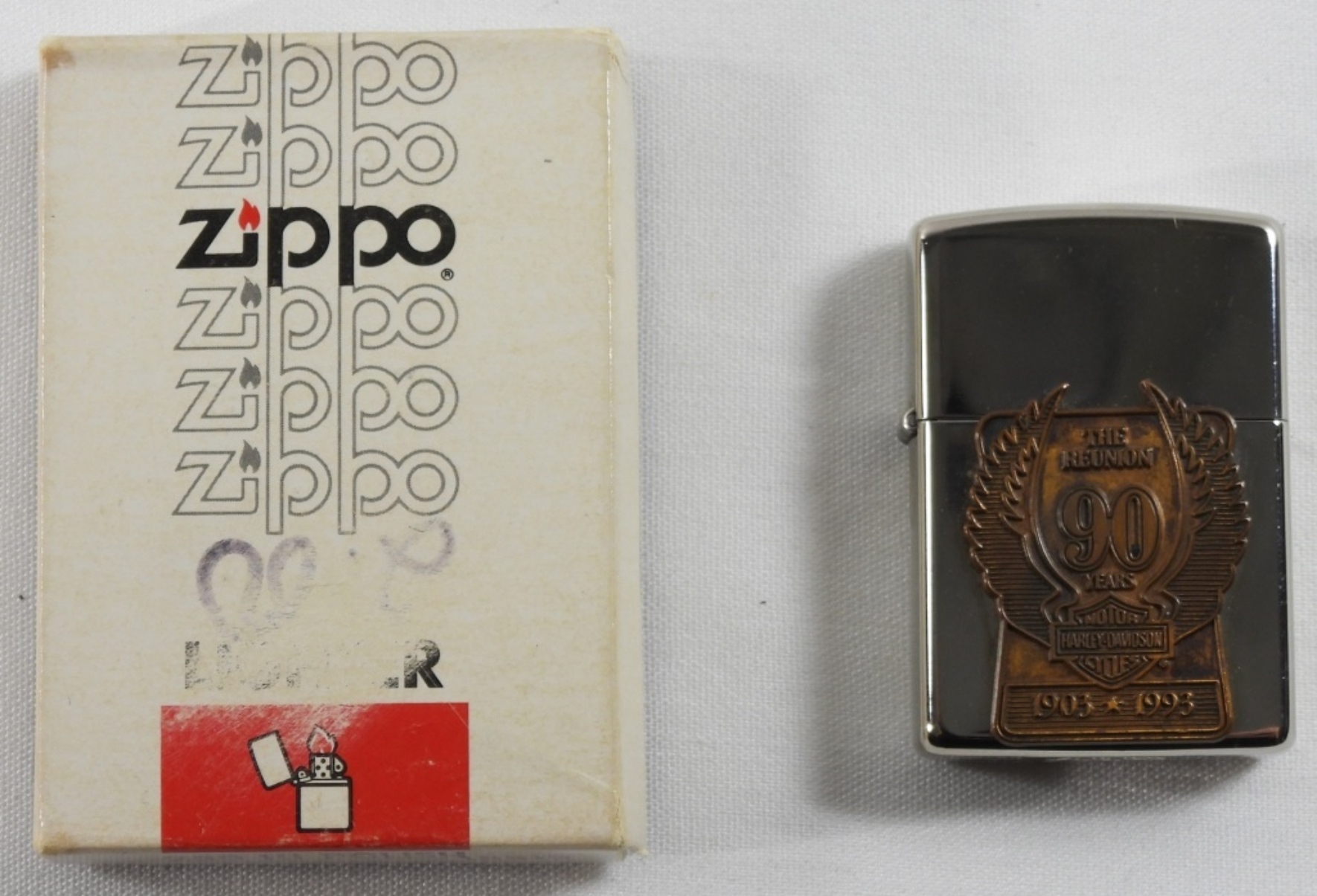 Unfired 1993 90th reunion Harley Davidson Zippo in box.