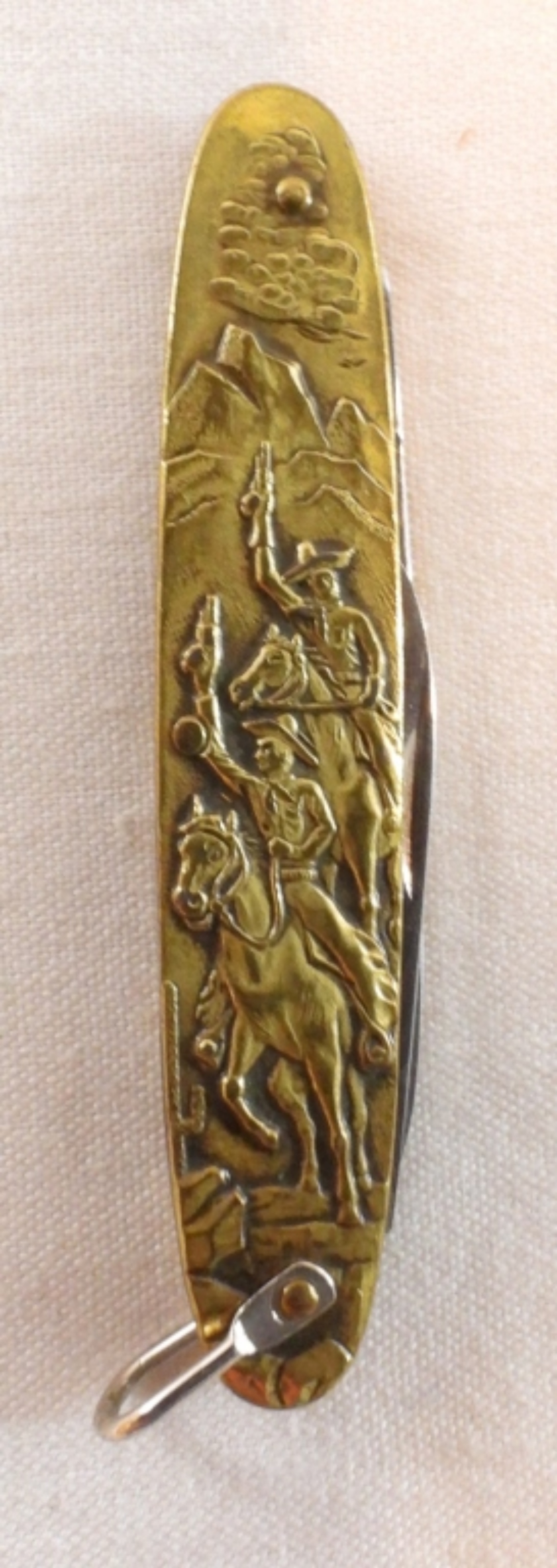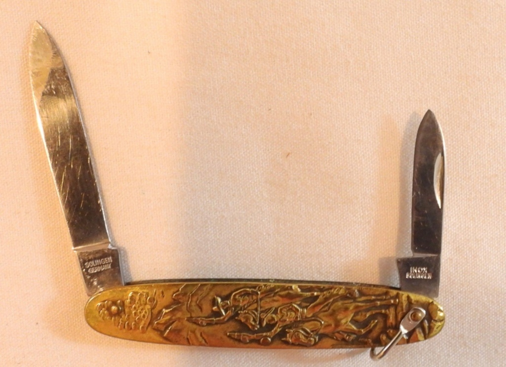 Solingen, Germany, double-bladed knife 1 1/4″, 2 1/4″, both sides featuring riders on horses, handle length 3 1/4″