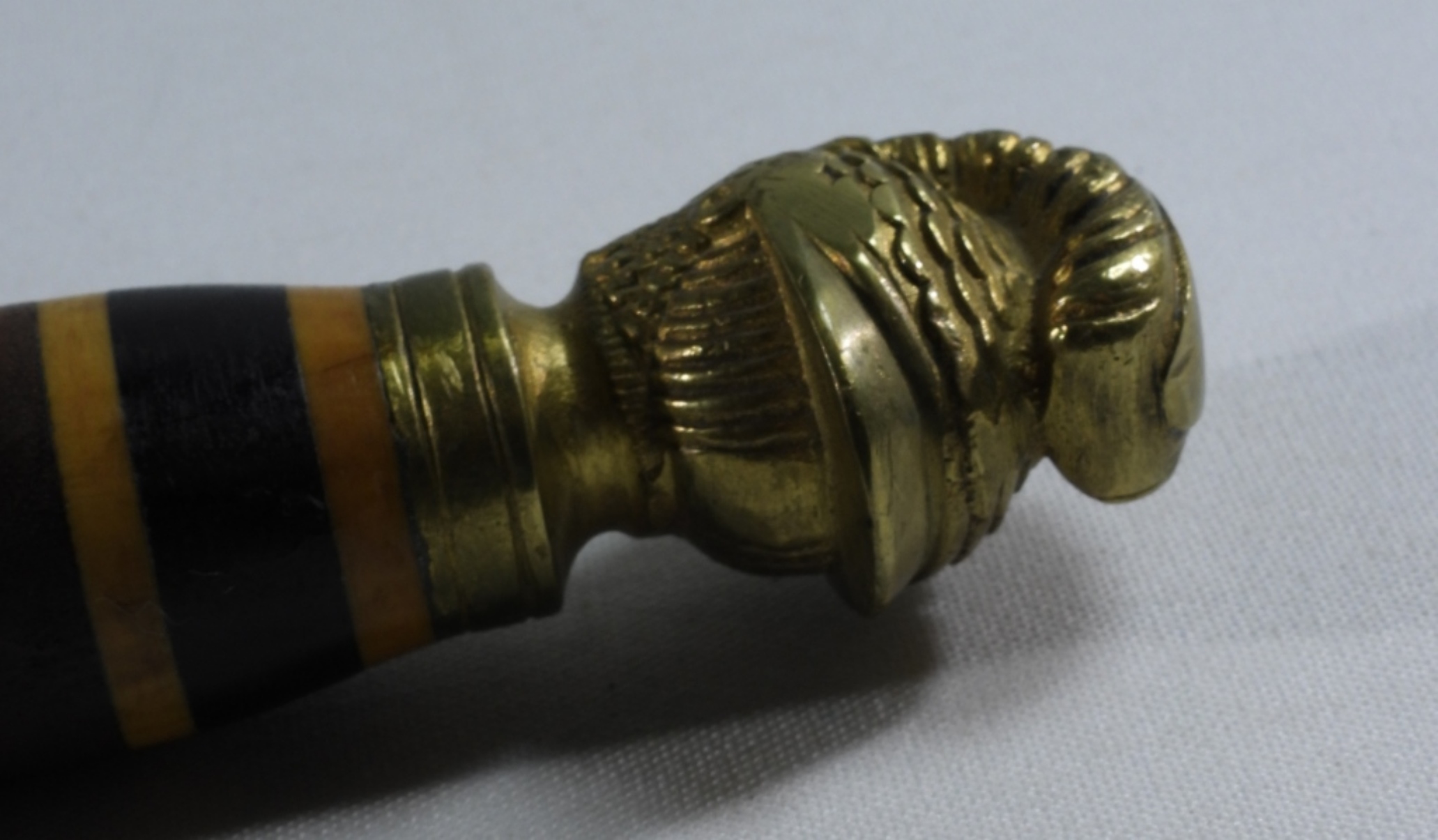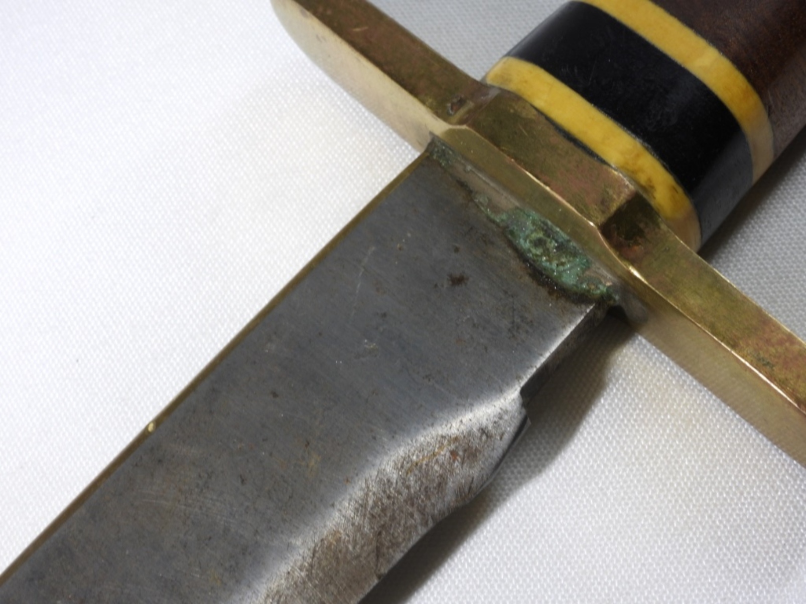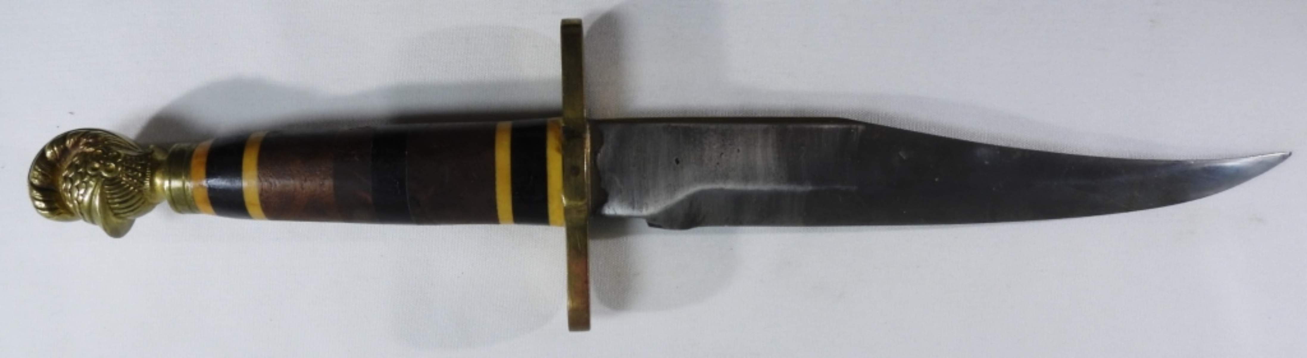 This large 14-inch knife with and 8 inch blade, with an ornate hilt that had a helmet-shaped pommel