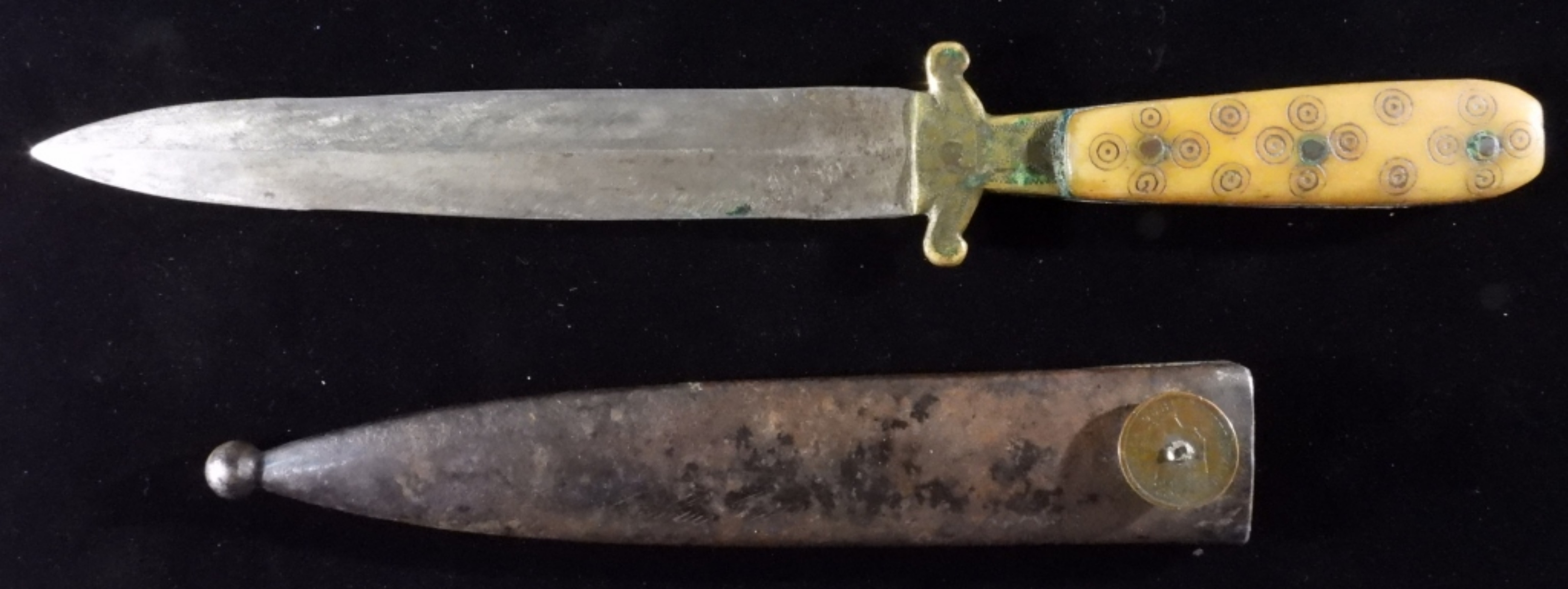 5 7/8inch Blade 10inch Long. The sheath is metal and has a 1896 Indian Head Penny on the sheath