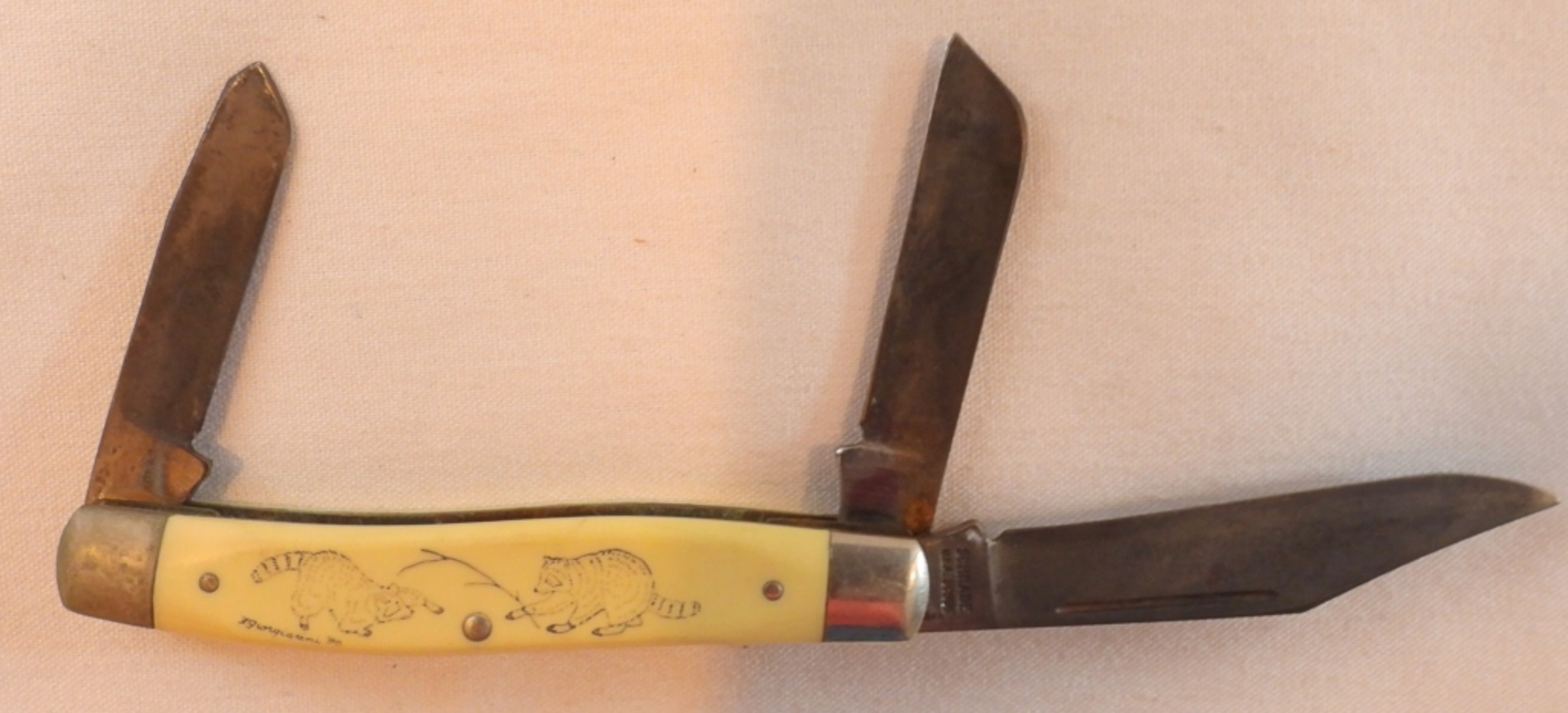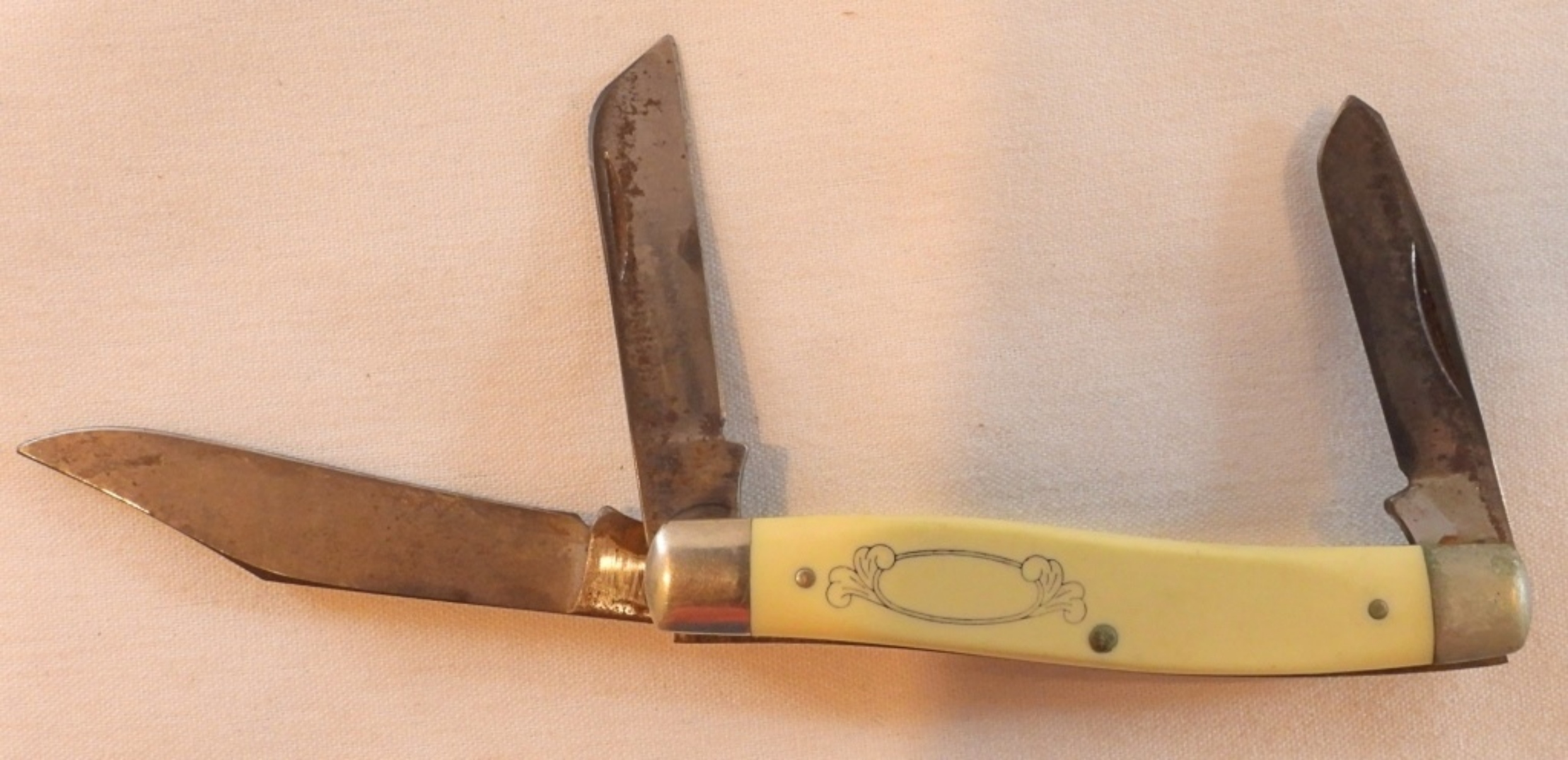 vintage Schrade knife in original box, 4″ handle, tri-blades