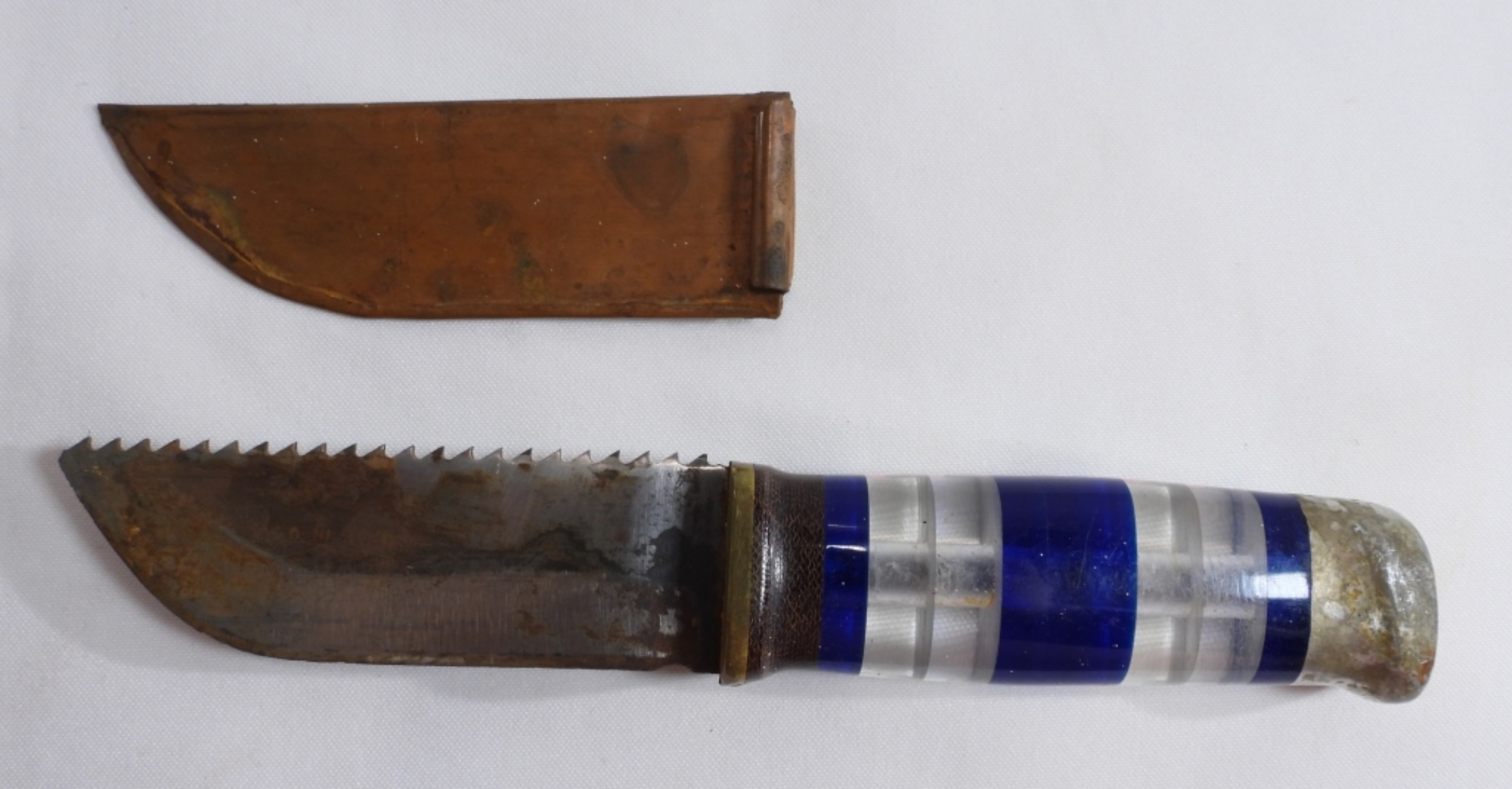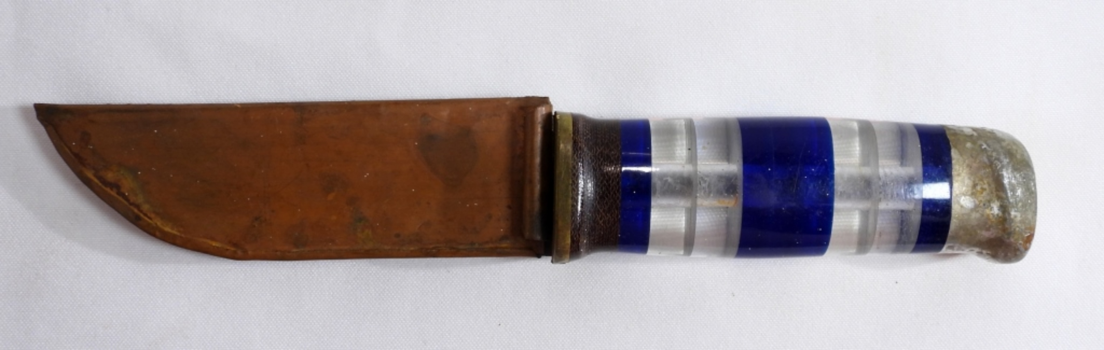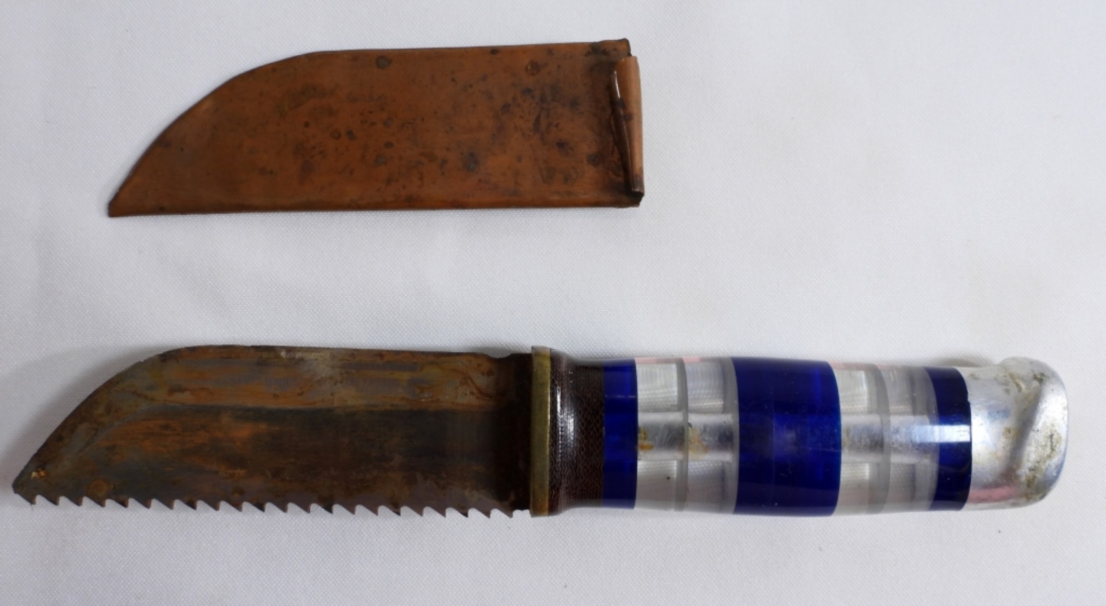 This jagged blade and blue to clear handle comes with a hand forged copper sheath