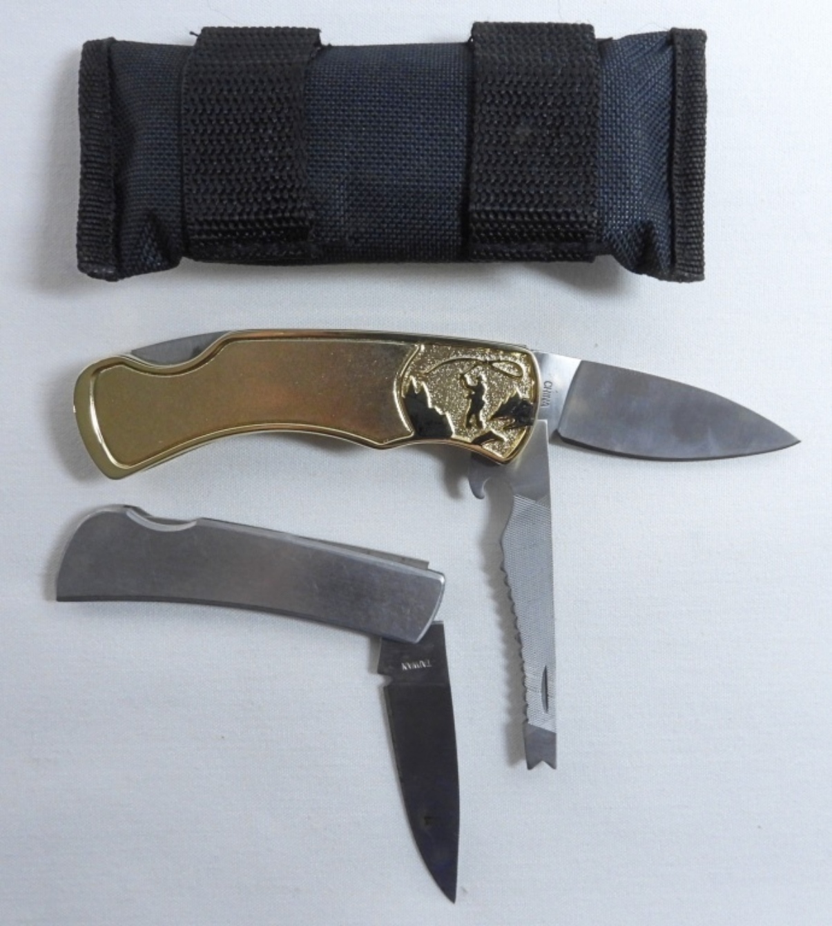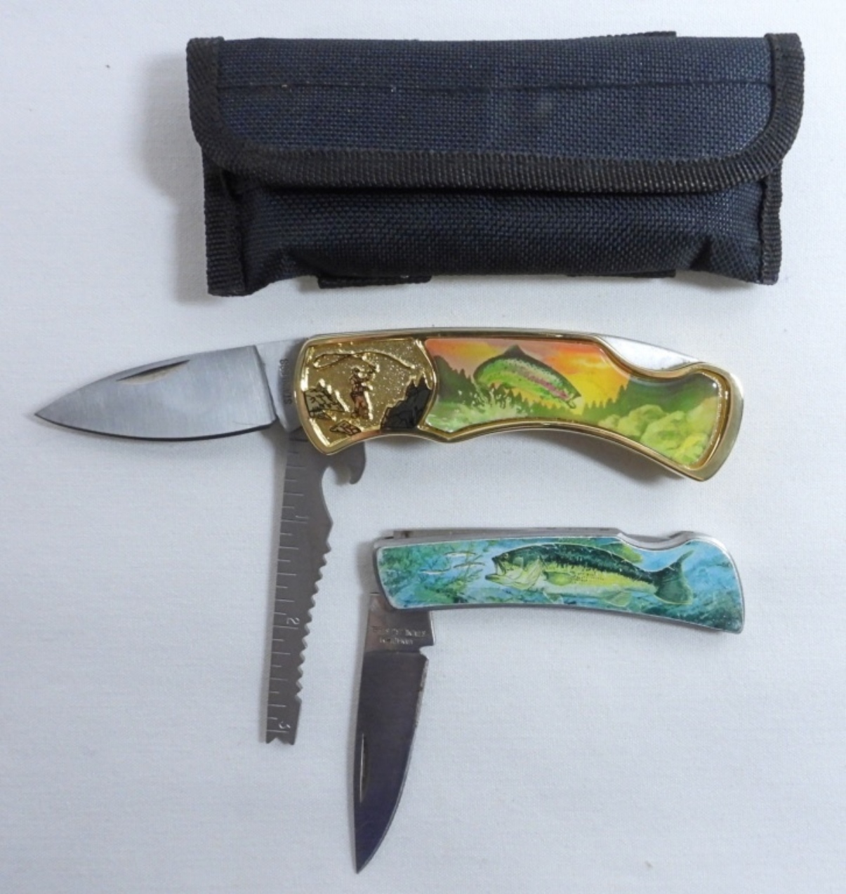 Vanadium stainless steel pocket knife with a total length of 6″, stainless steel 2 blade pocket knife with fishing motif, 2 1/2″ blade, and a 3″ saw blade with ruler, comes in black case
