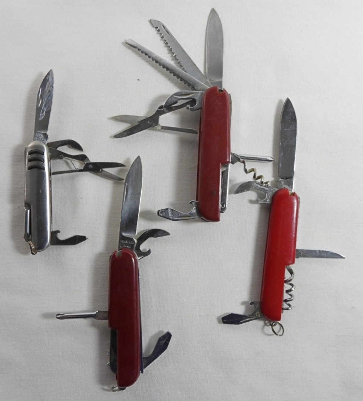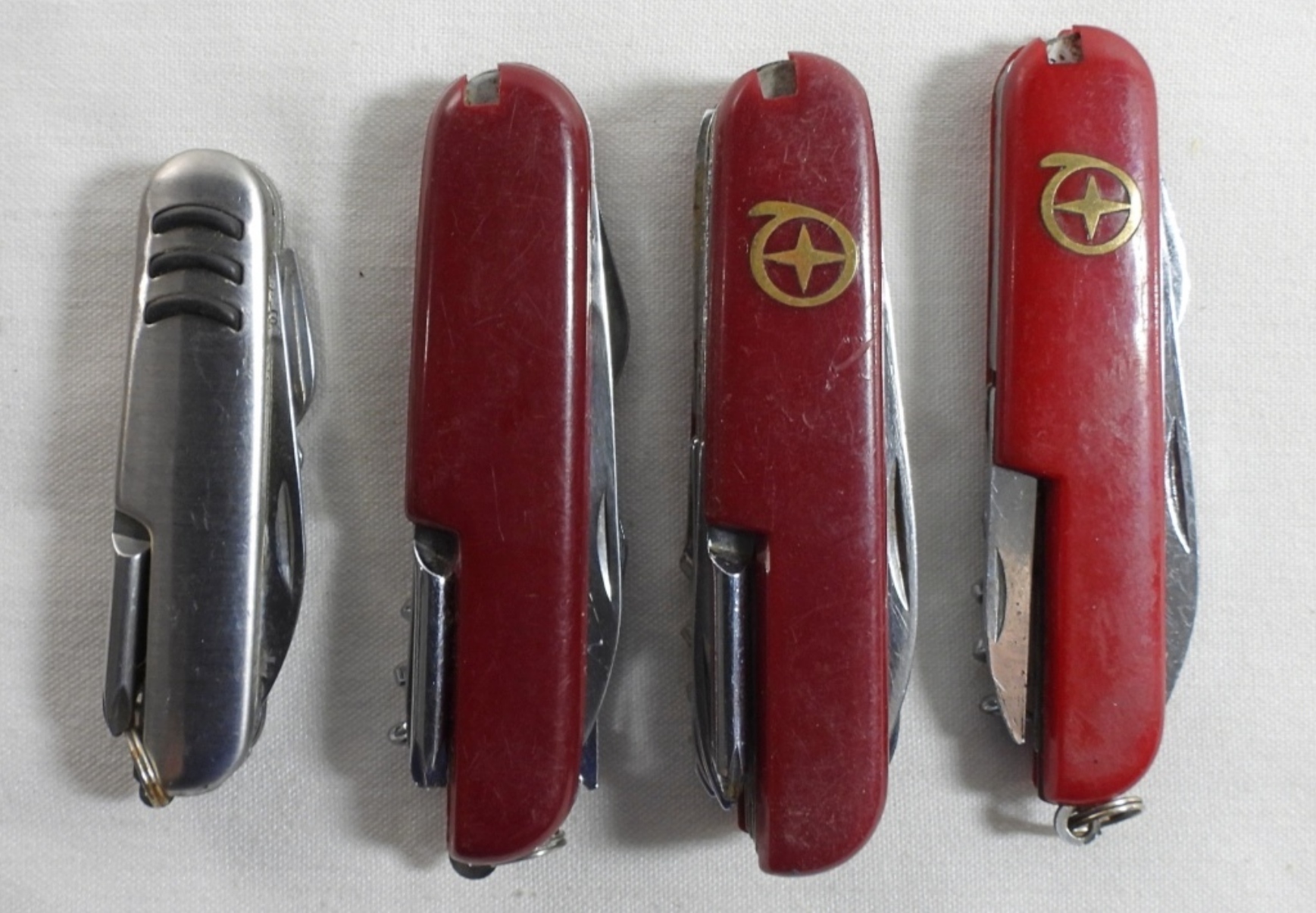 3 red and 1 silver-tone pocket knives, 3″ to 3 1/2″
