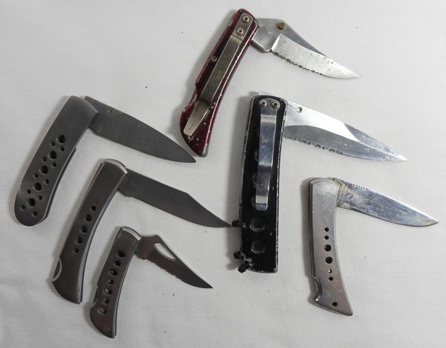 6 folding skeleton handle pocket knives 4″ to 5″ lengths, including Ridge Runner and Silver Falcon (has some rust)