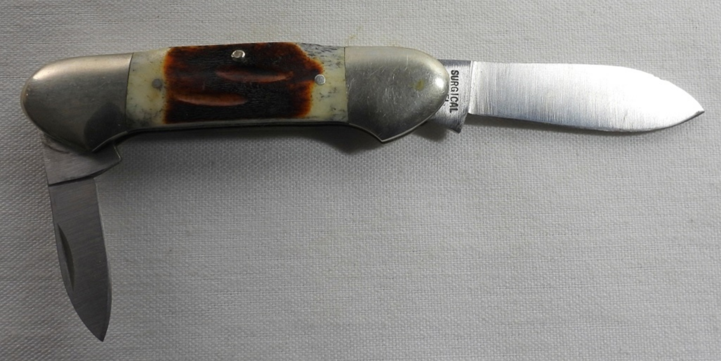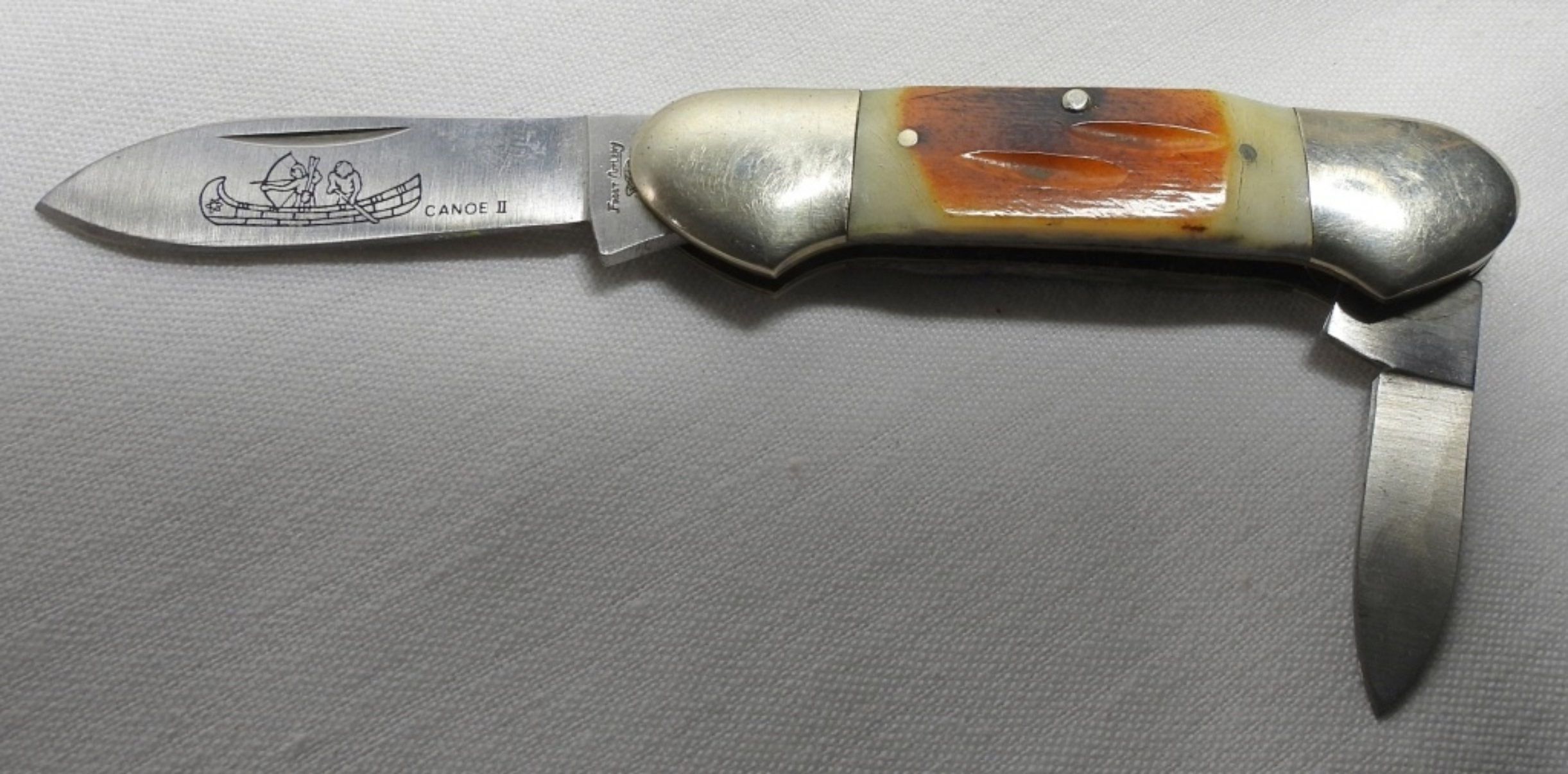 Two-blade pocket knife with two Native Americans in a canoe. One is rowing while the other shoots an arrow