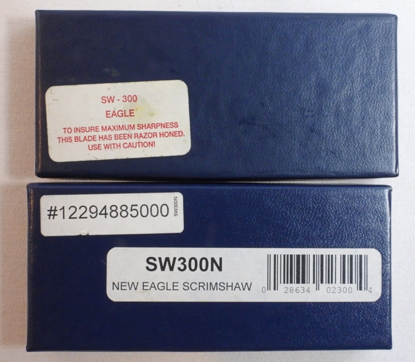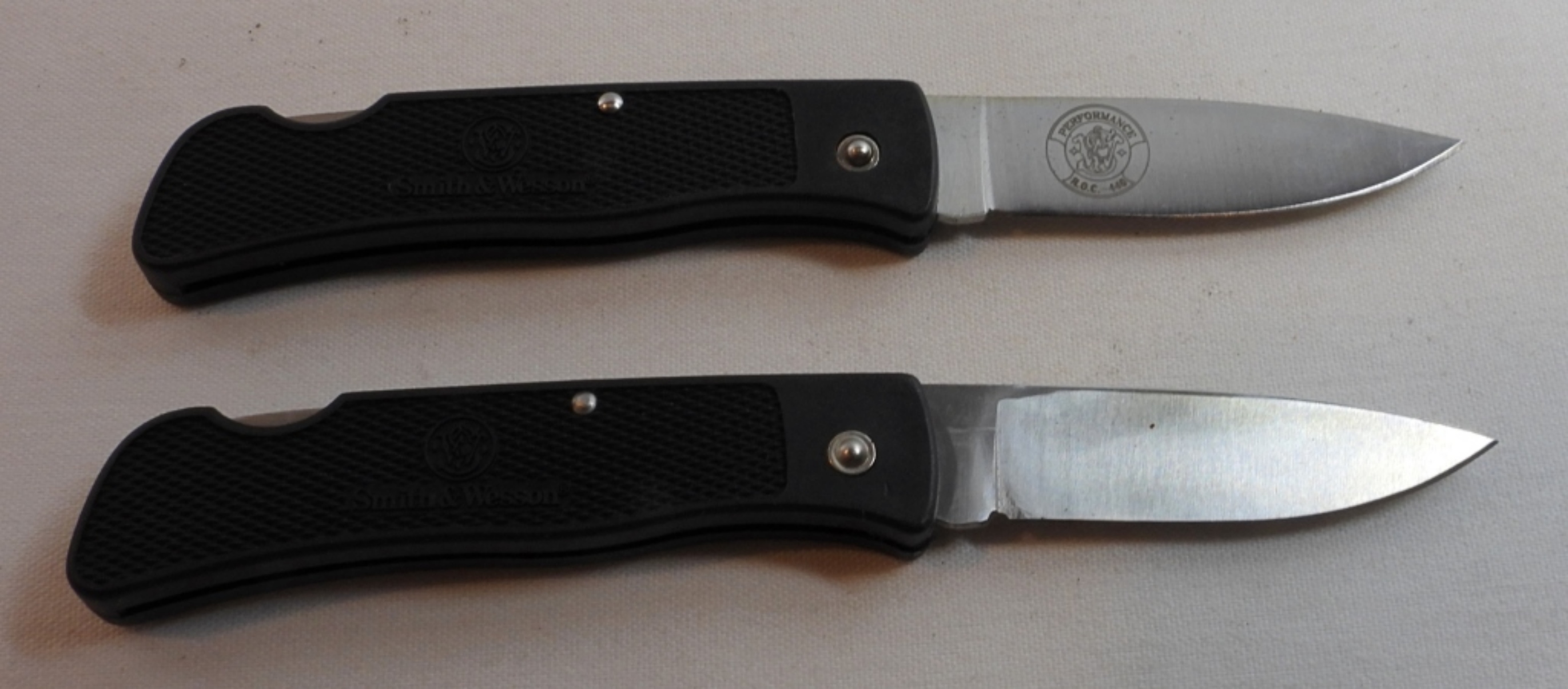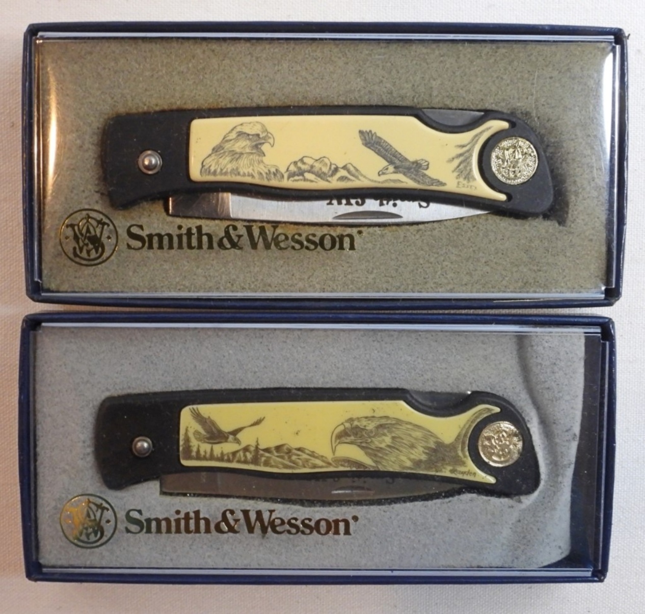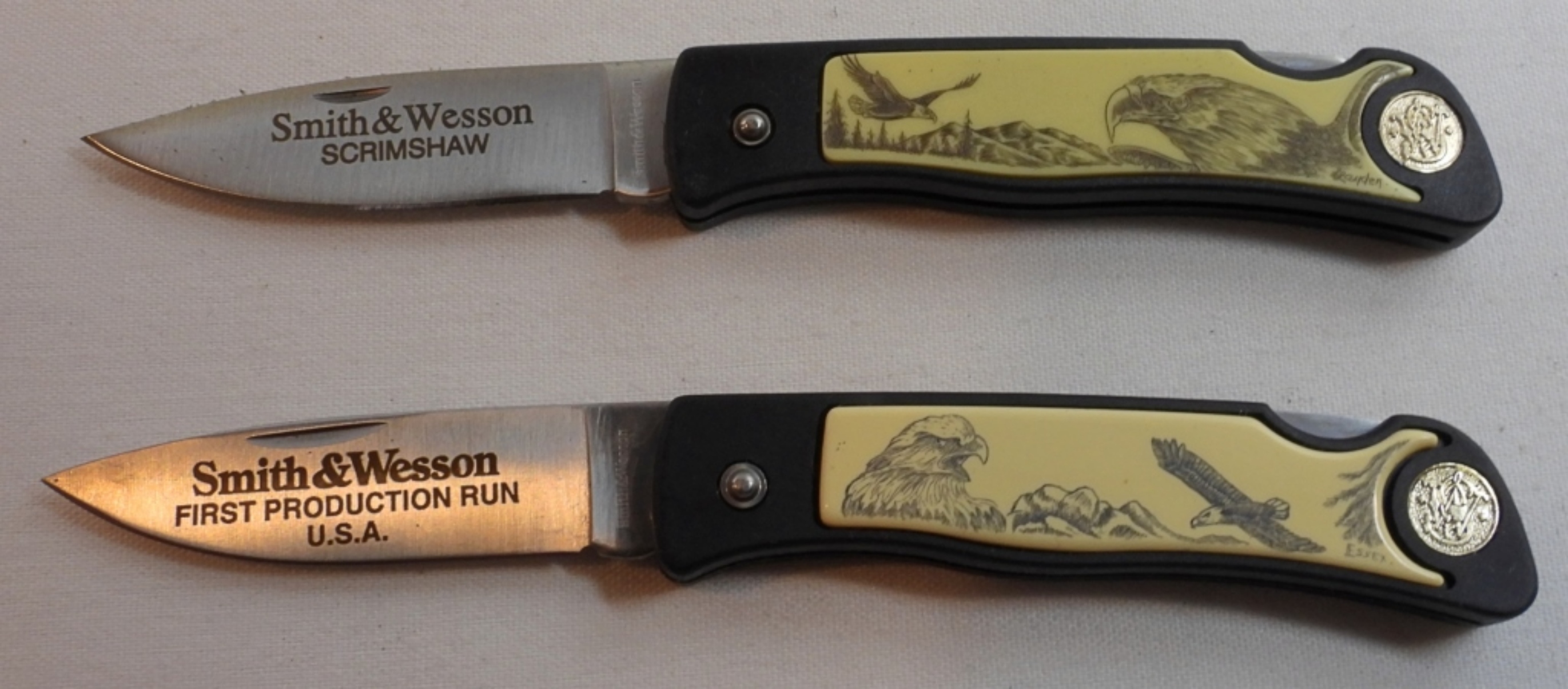 2 Smith & Wesson Pocket knives, first production run, both displaying eagles on the handles, blade length 2 1/2″,total length 6 “
