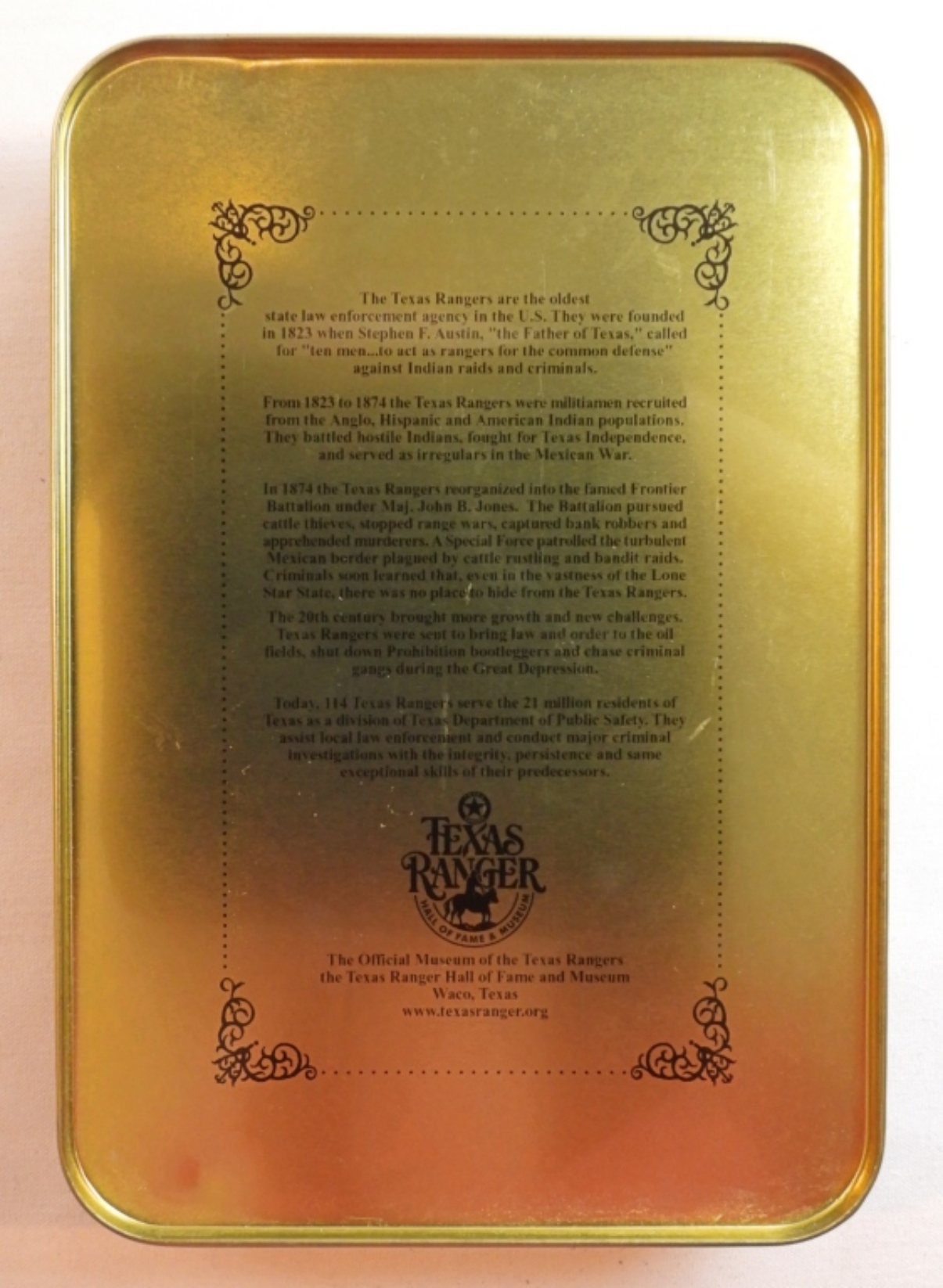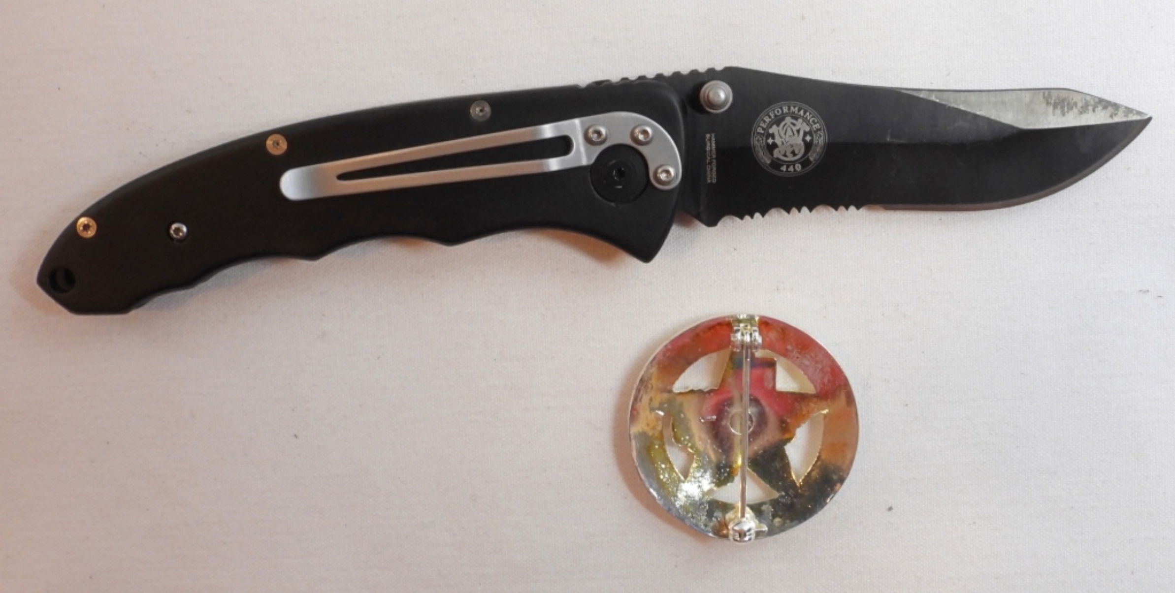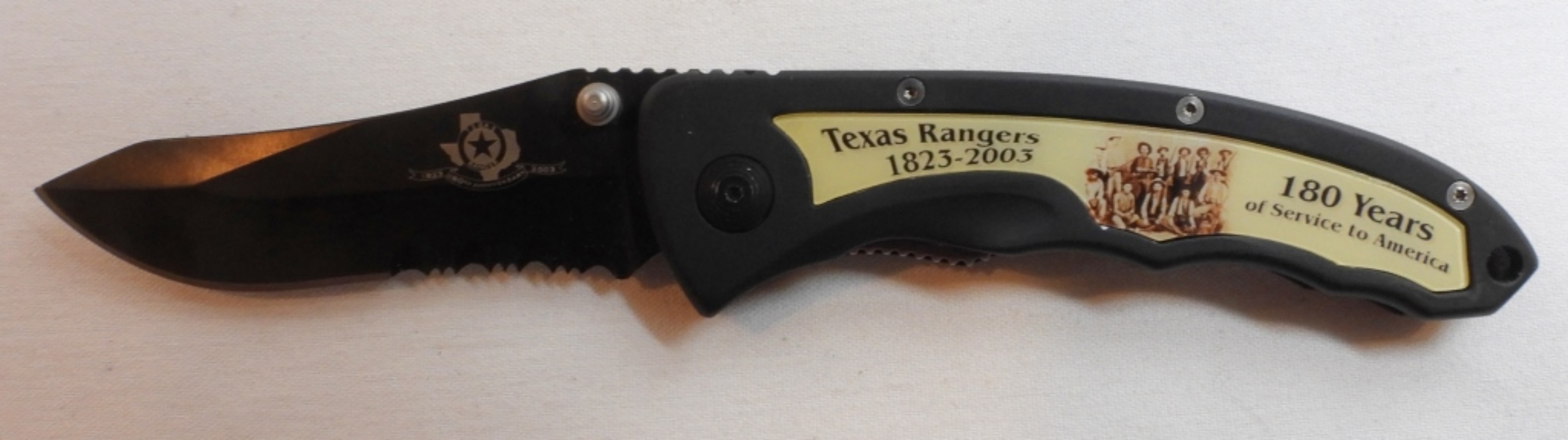 Smith & Wesson Texas Rangers 180th anniversary knife and badge set in tin, blade 3 1/2″, total length 8 1/2″