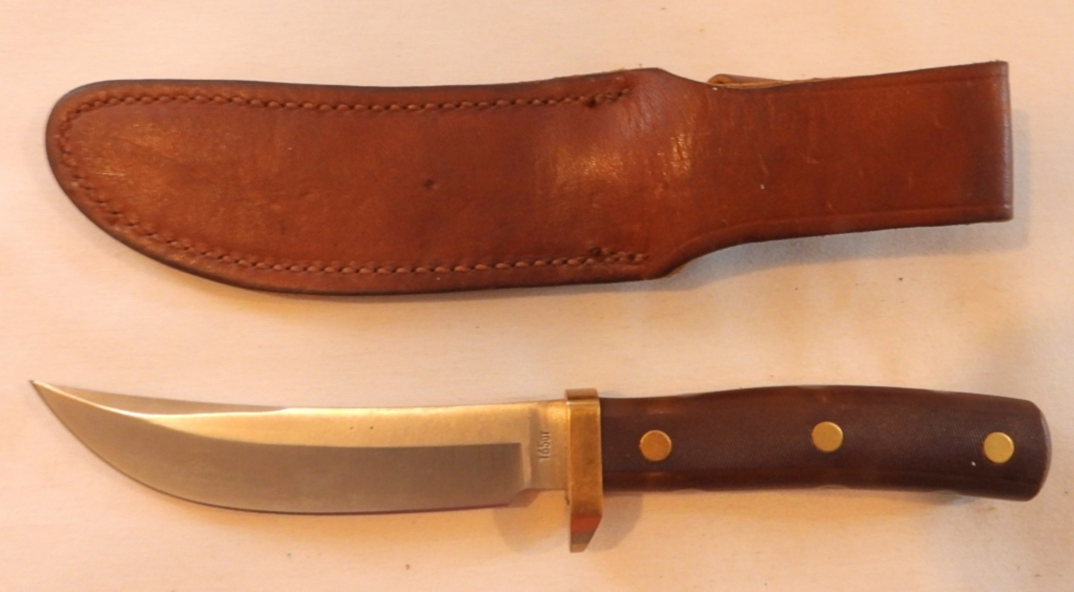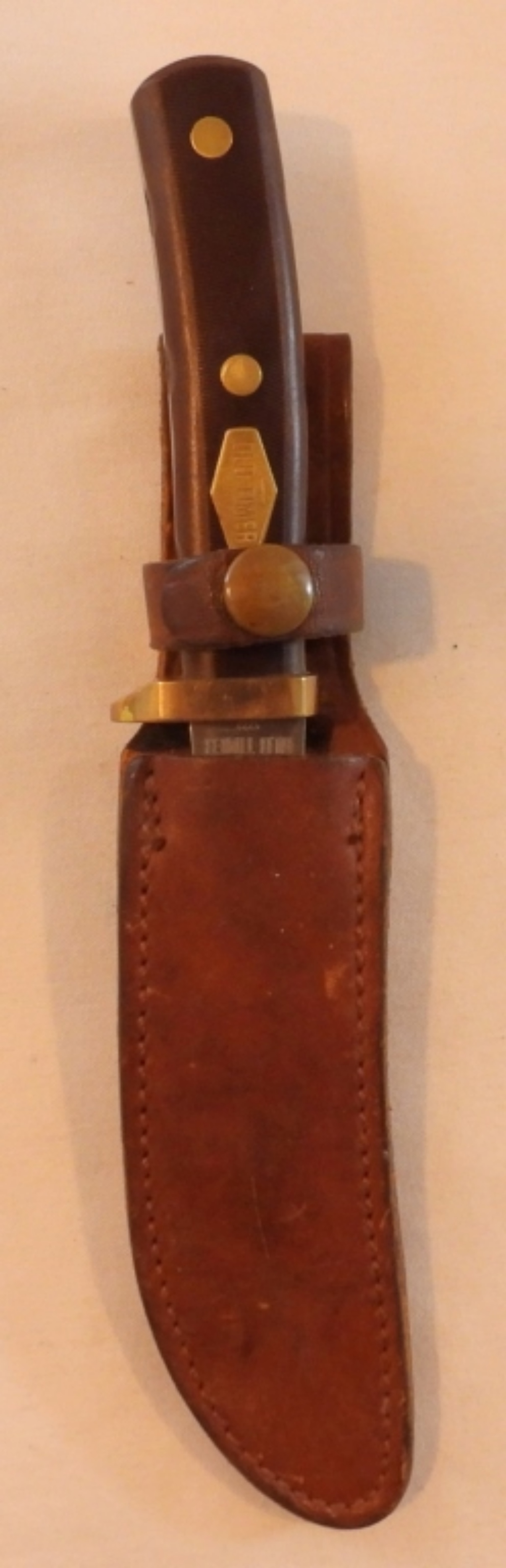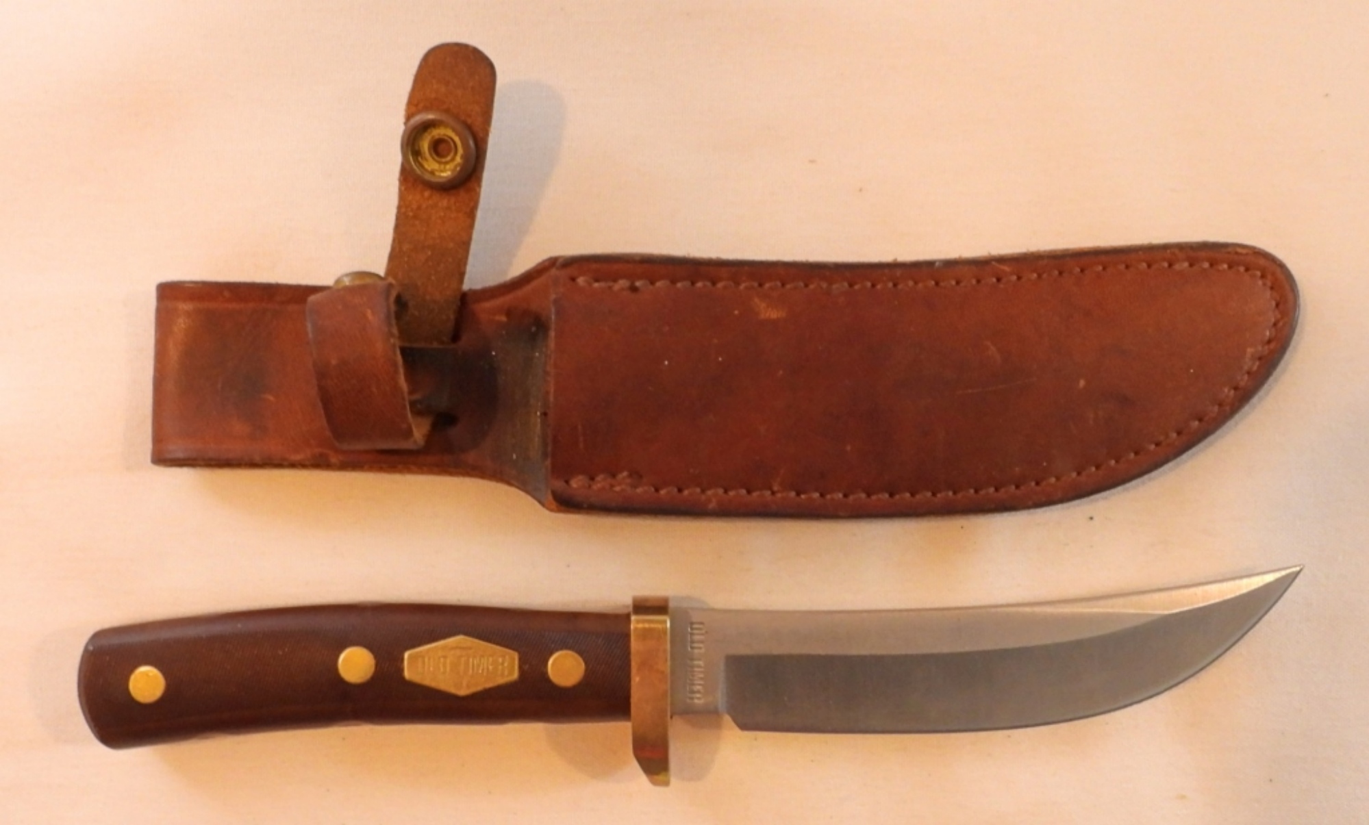 Old Timer Woodsman 1222, 165OT, blade length 5″, total length 9 1/4″, sheath has seen wear, snap works well