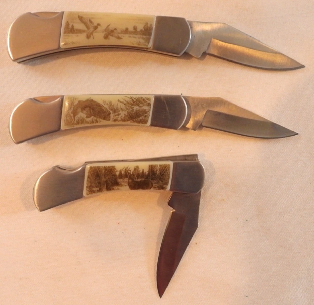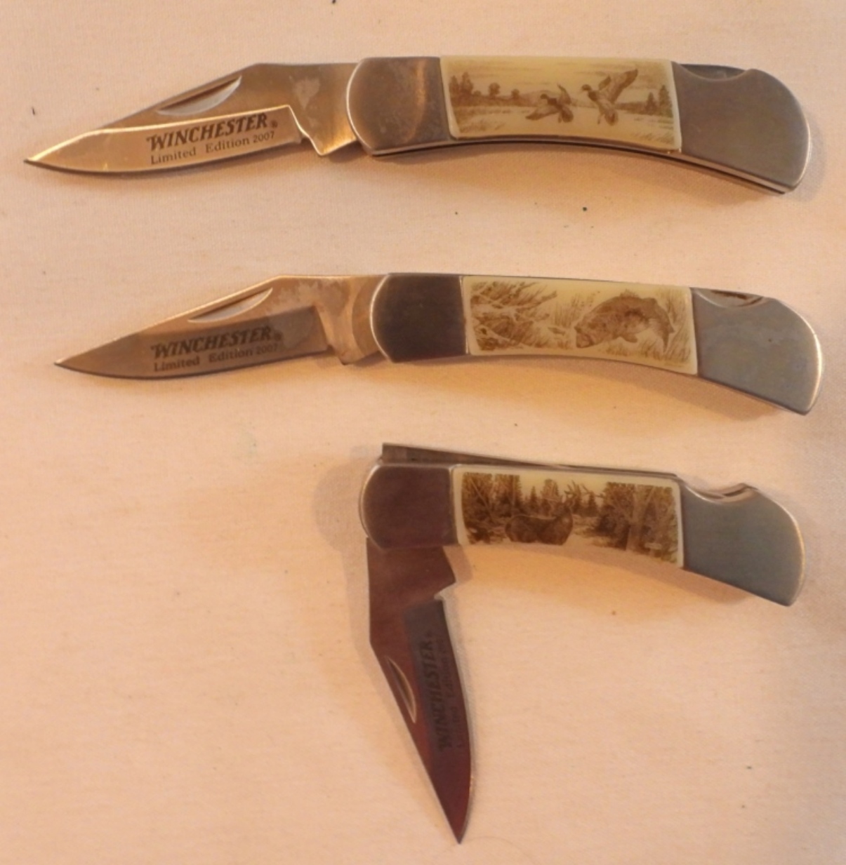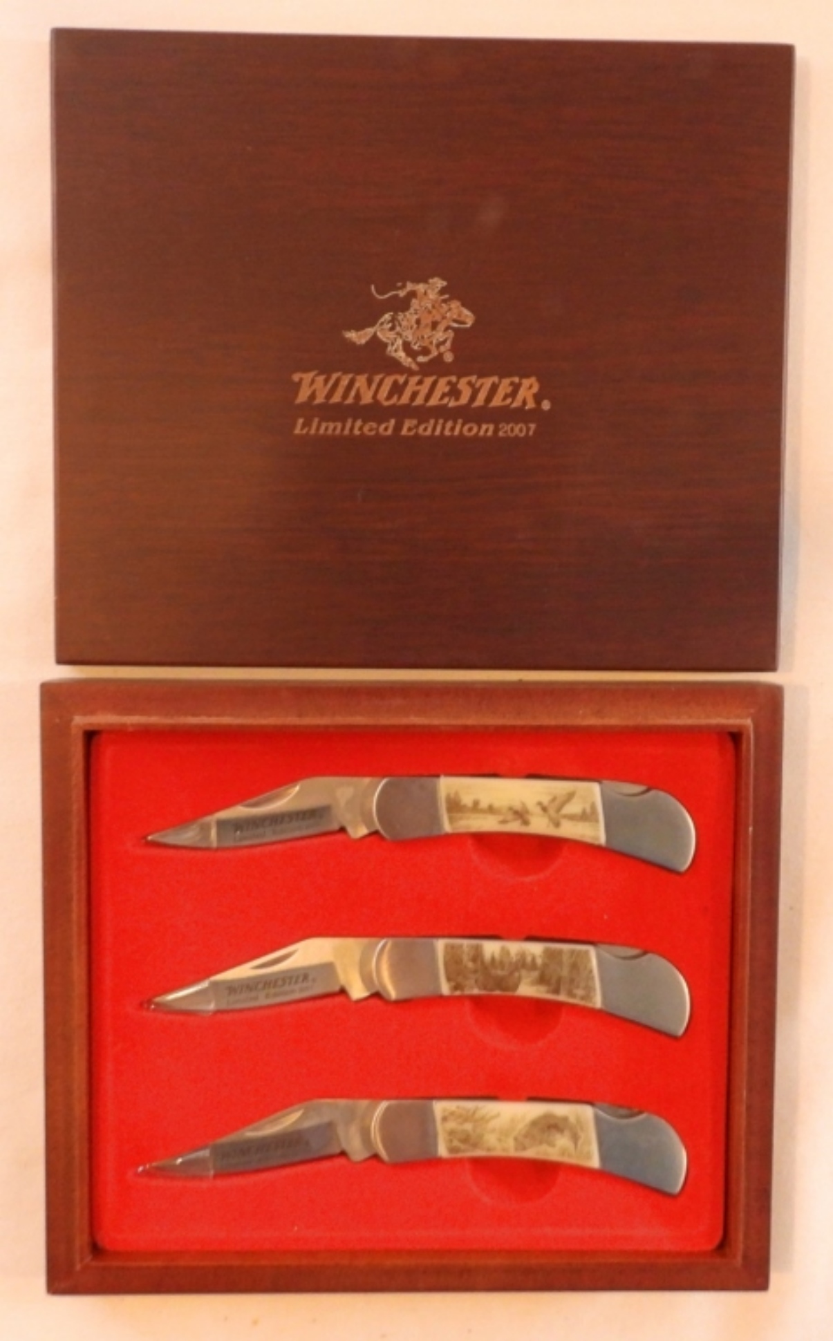 3 Winchester limited edition pocket knives in a wooden box each knife has a blade of 2 1/2″ , and a full length of 5 3/4″, featuring beautiful images of wildlife